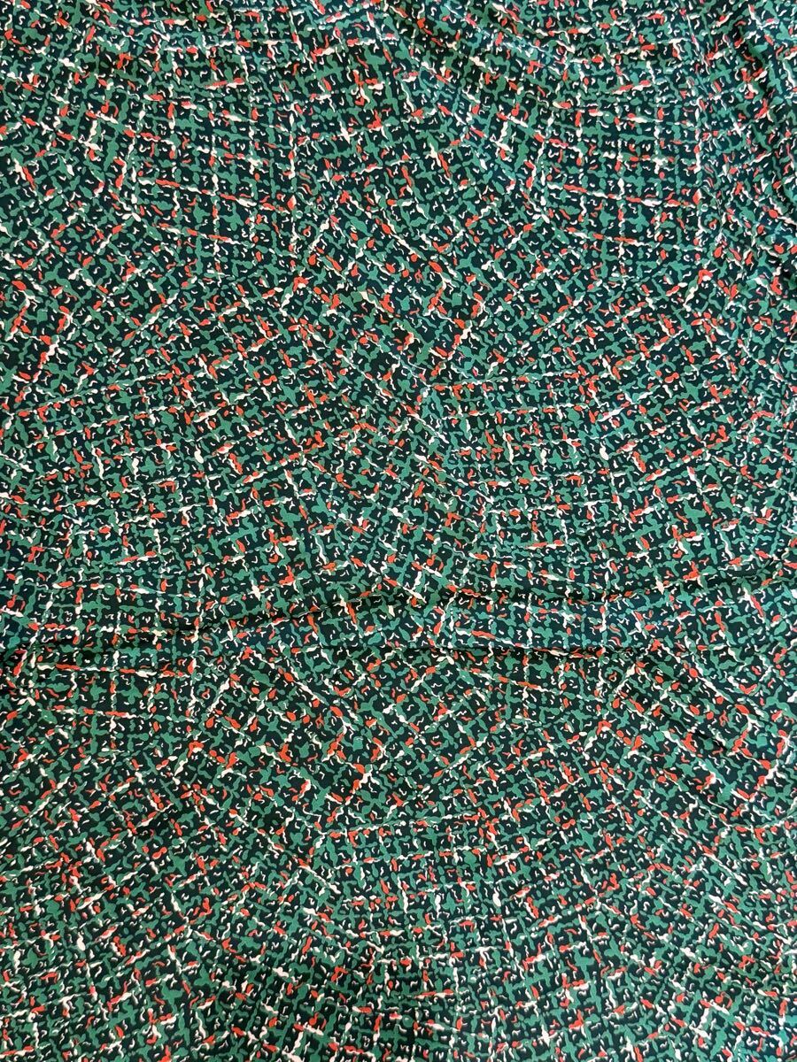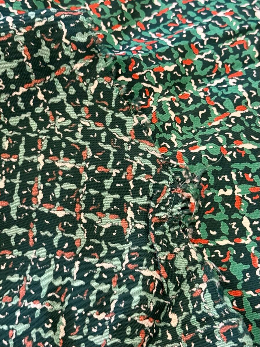 ダークグリーンベースで、グリーン、オレンジ、ホワイトの抽象的な総柄プリント。