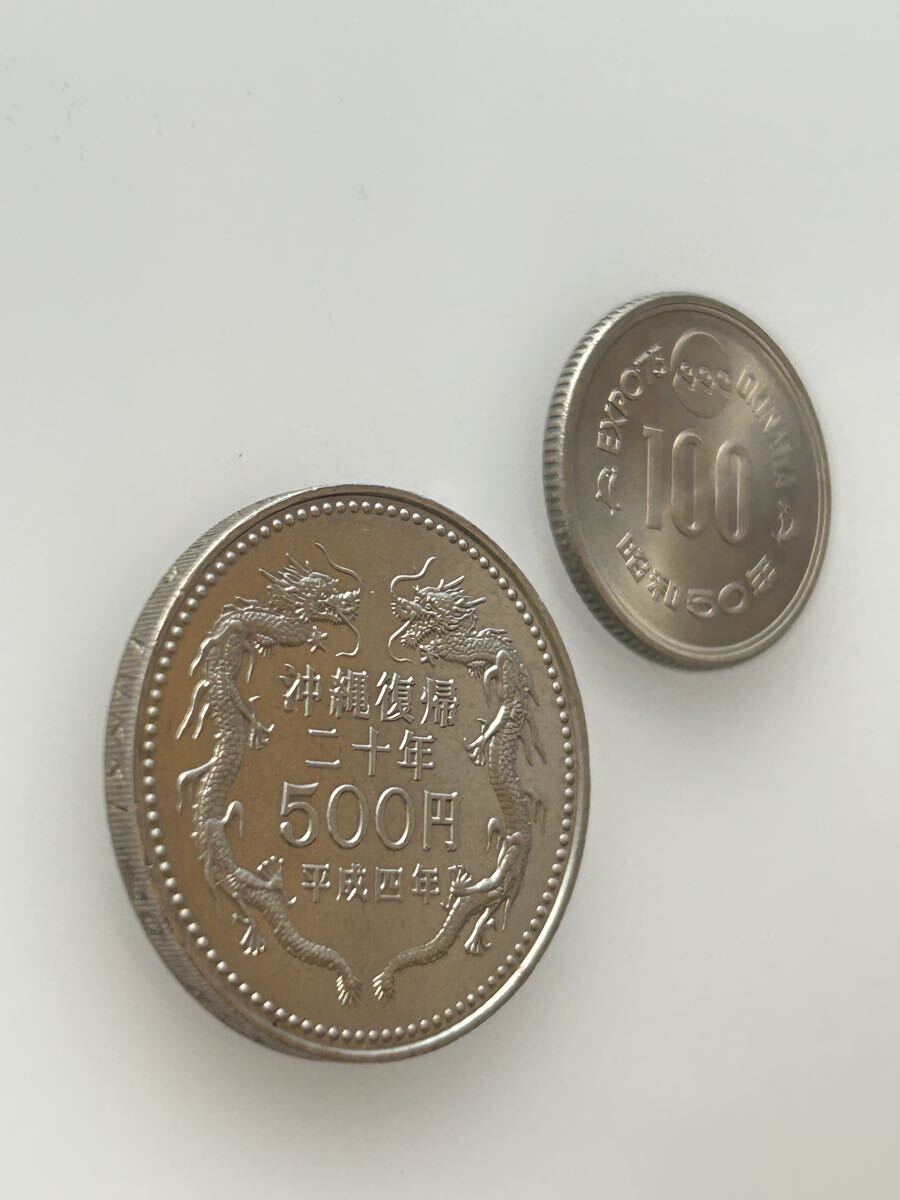 1992q年(平成4年)に発行された、沖縄復帰20周年を記念する500円硬貨です。