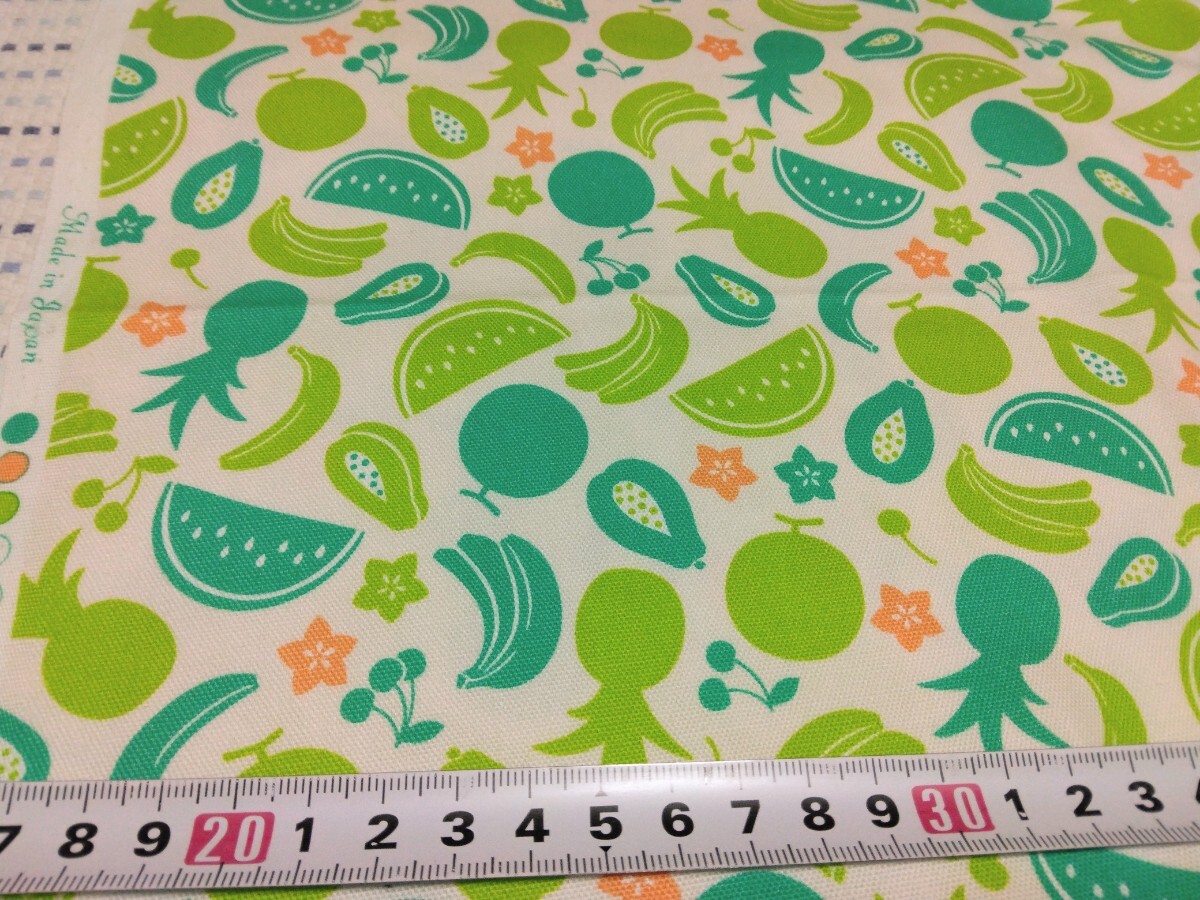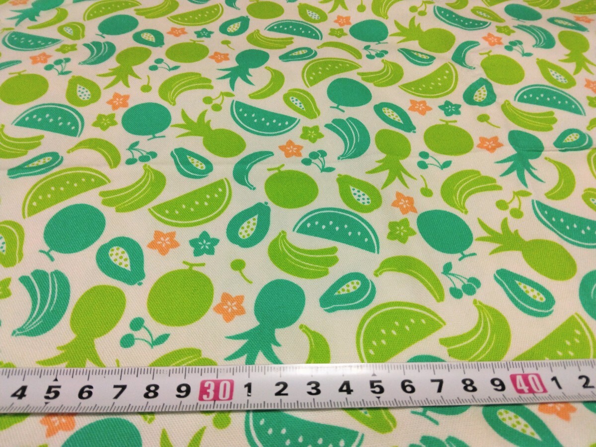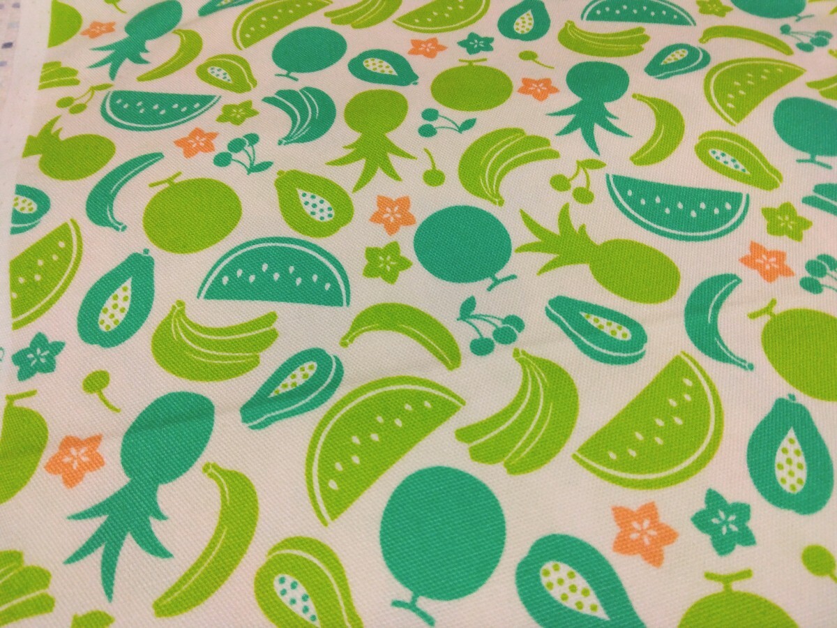 パイナップル・メロン・スイカ・チェリーなどのフルーツ柄のオックス生地です。110×48センチの金額になります。