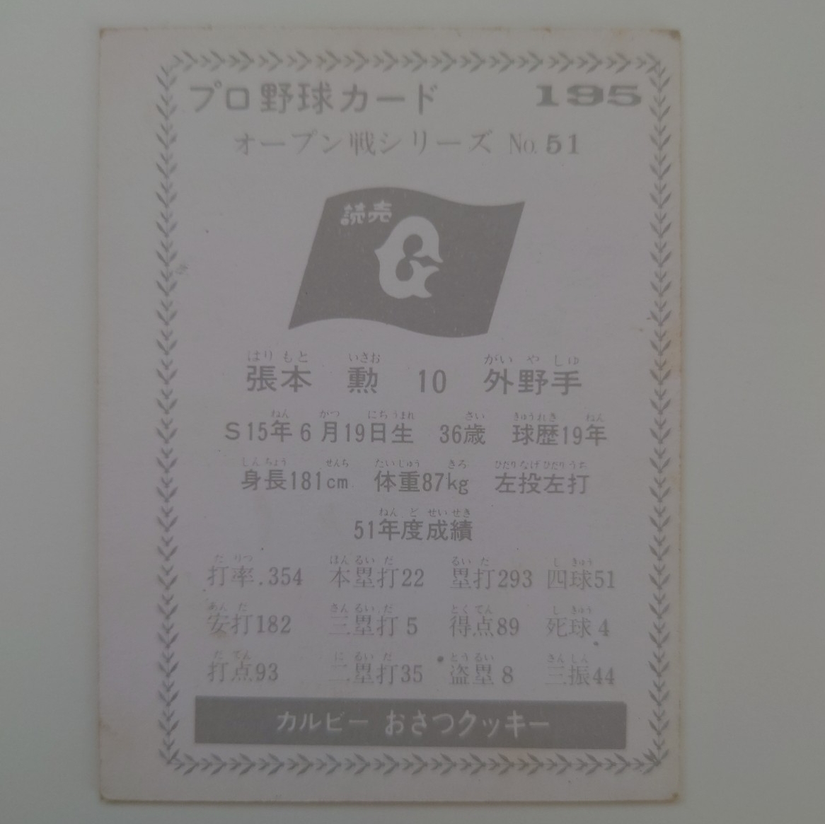 カルビー プロ野球カード 1977年 No.195 オープン戦シリーズ No.51 読売ジャイアンツ 張本勲