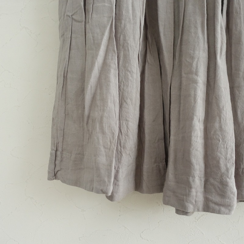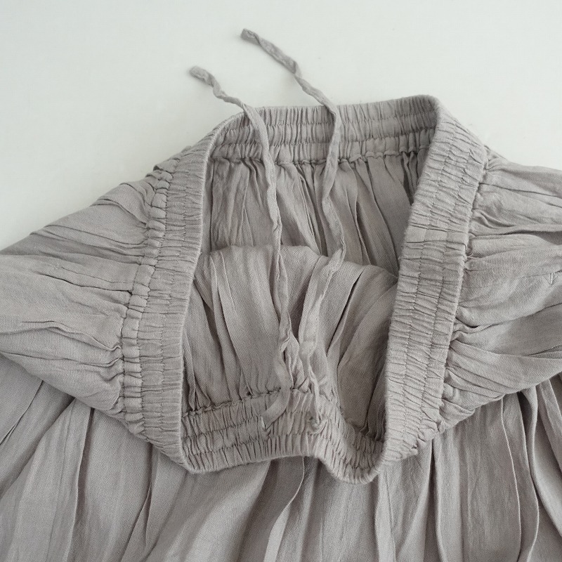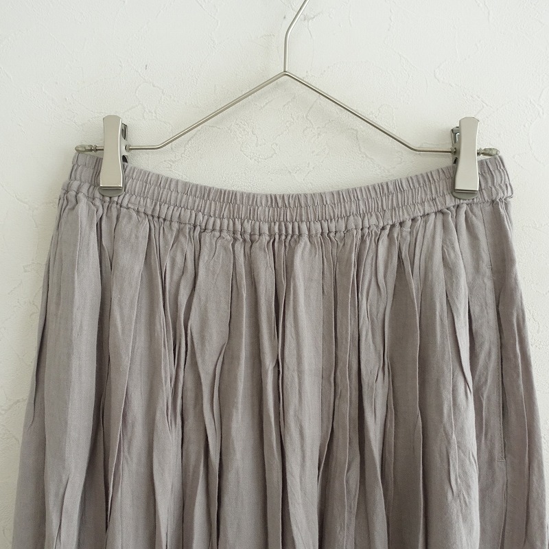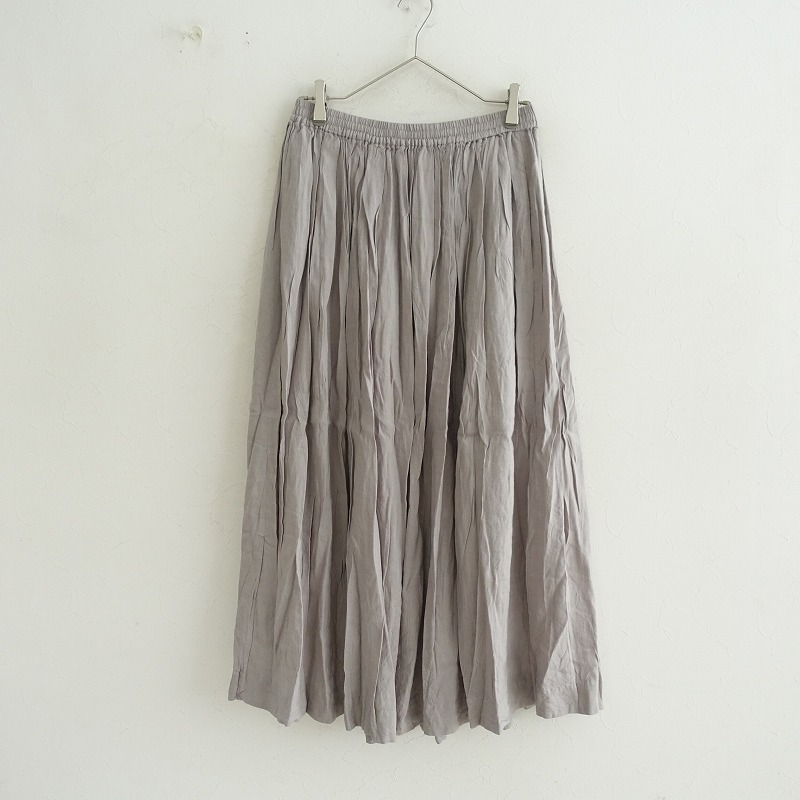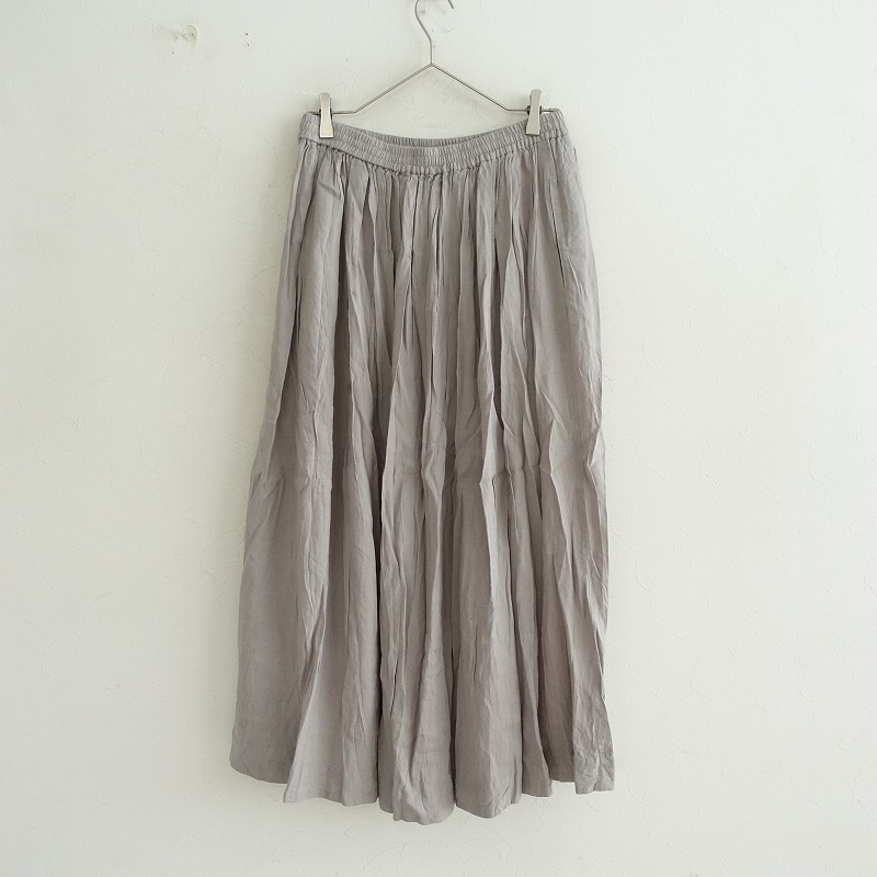 | 2024年コレクション Natural by clip のリネンレーヨンタックギャザースカートです。カラーはライトグレーです。麻とレーヨンのナチュラルなシワを配した程よい厚みの生地を使用。落ち感があり、うっすら透け感がございます。ウエストはゴム&紐入りのイージー仕様。腰帯の下にタック&ギャザーが施されております。両サイドにシームポケットがございます。 |