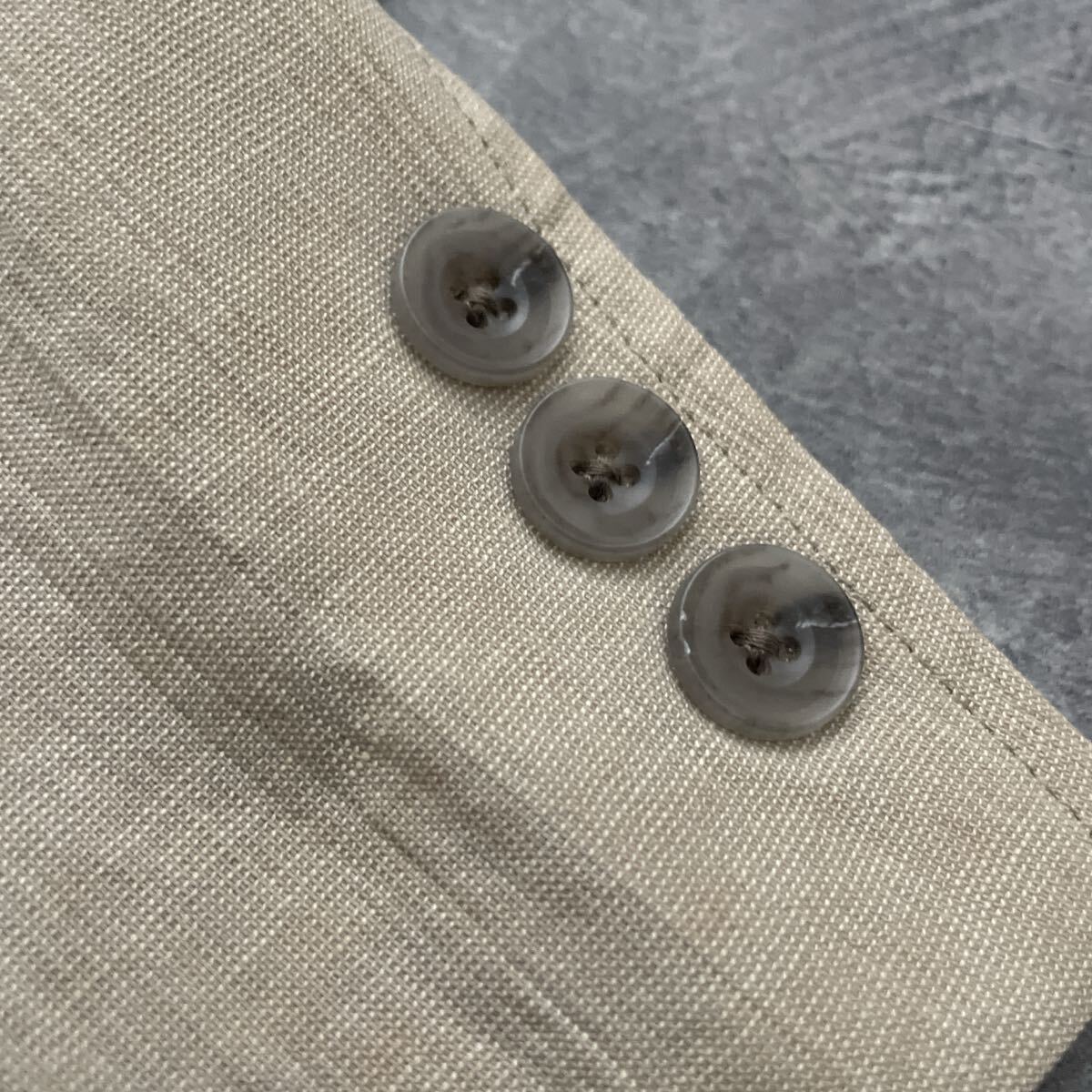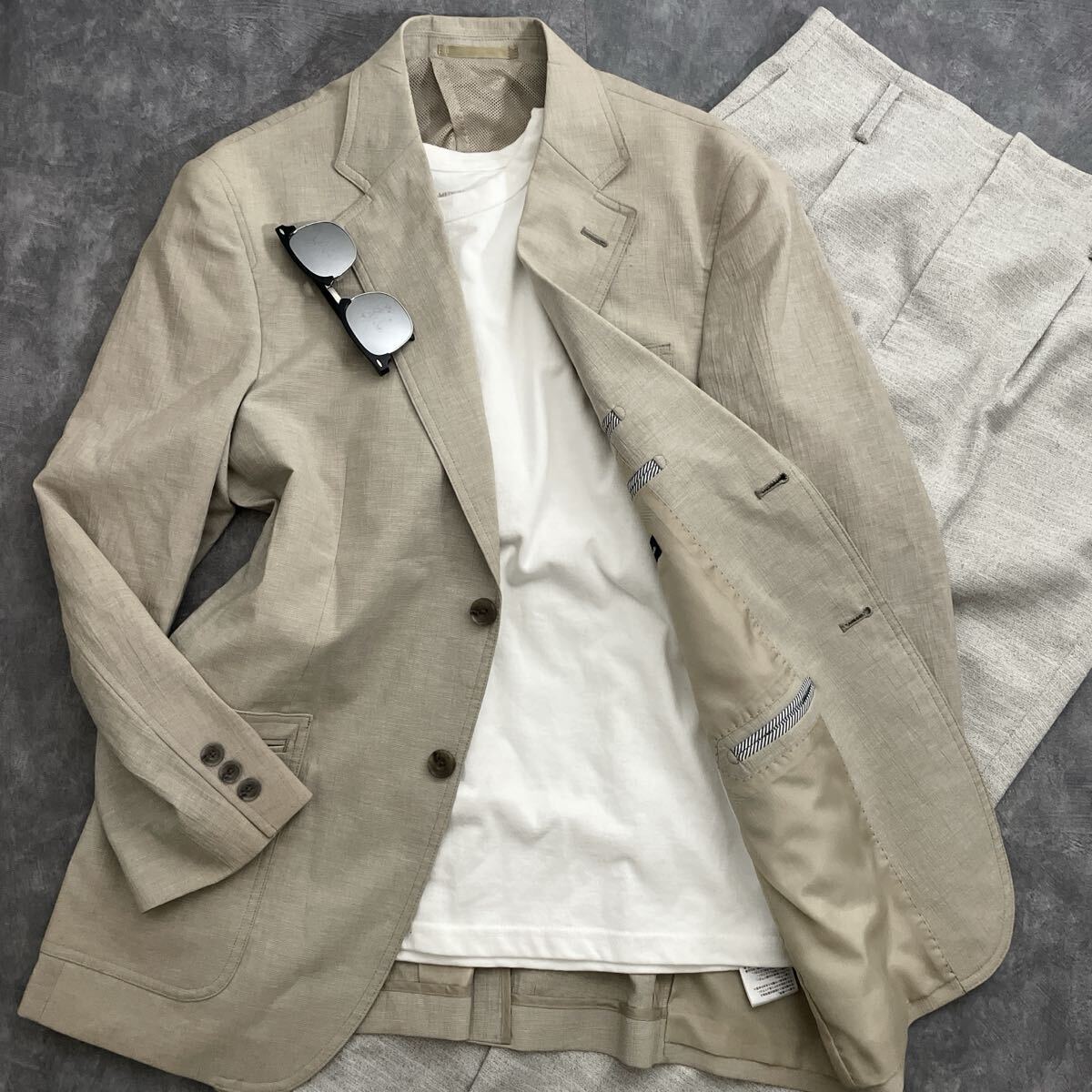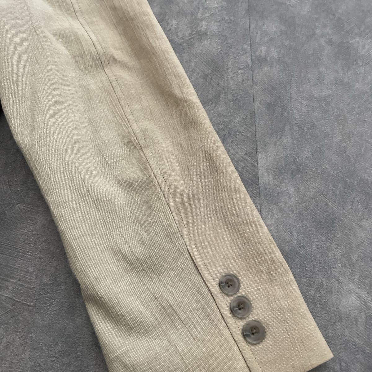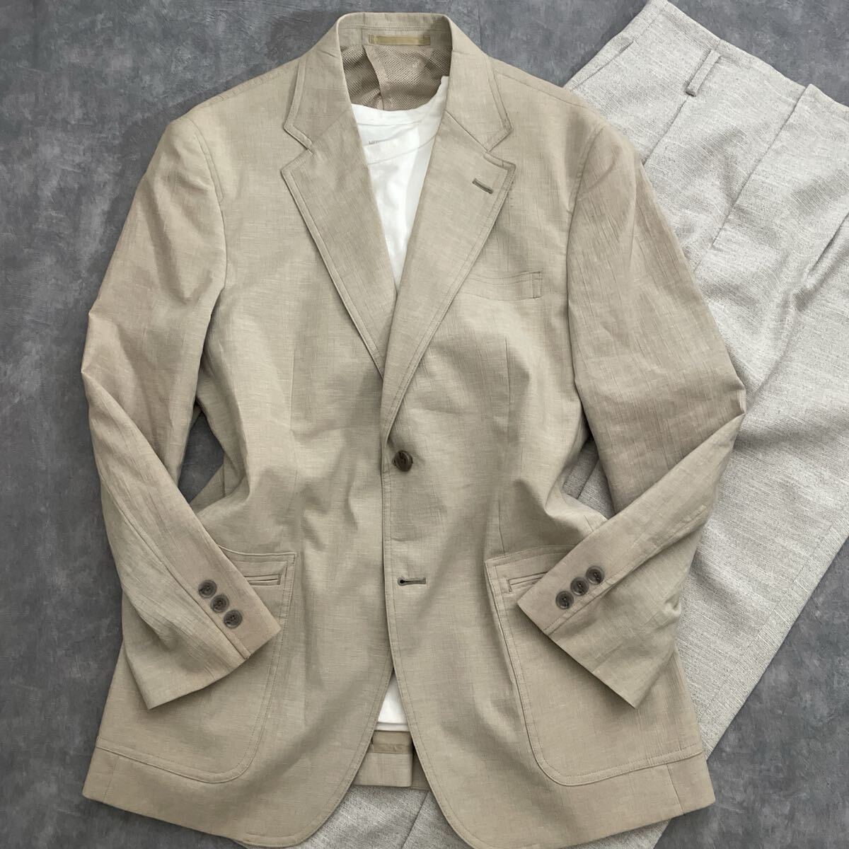 備考:清涼感のあるベージュ系のジャケット。ポリエステルに綿・麻をブレンドした生地で、軽やかさと通気性を兼ね備えています。