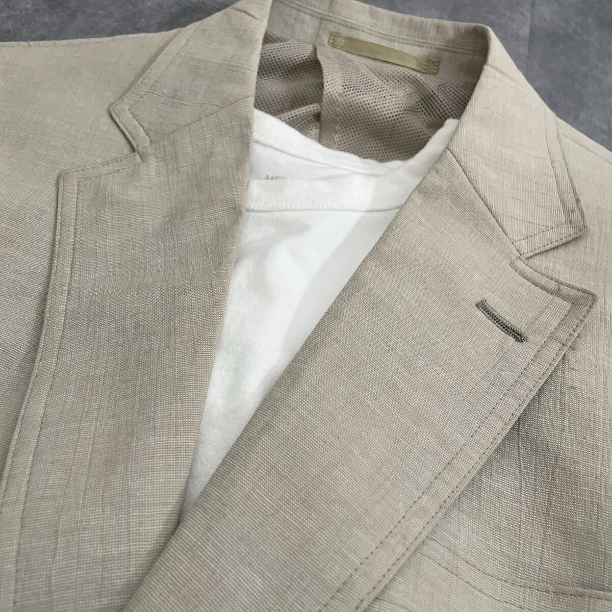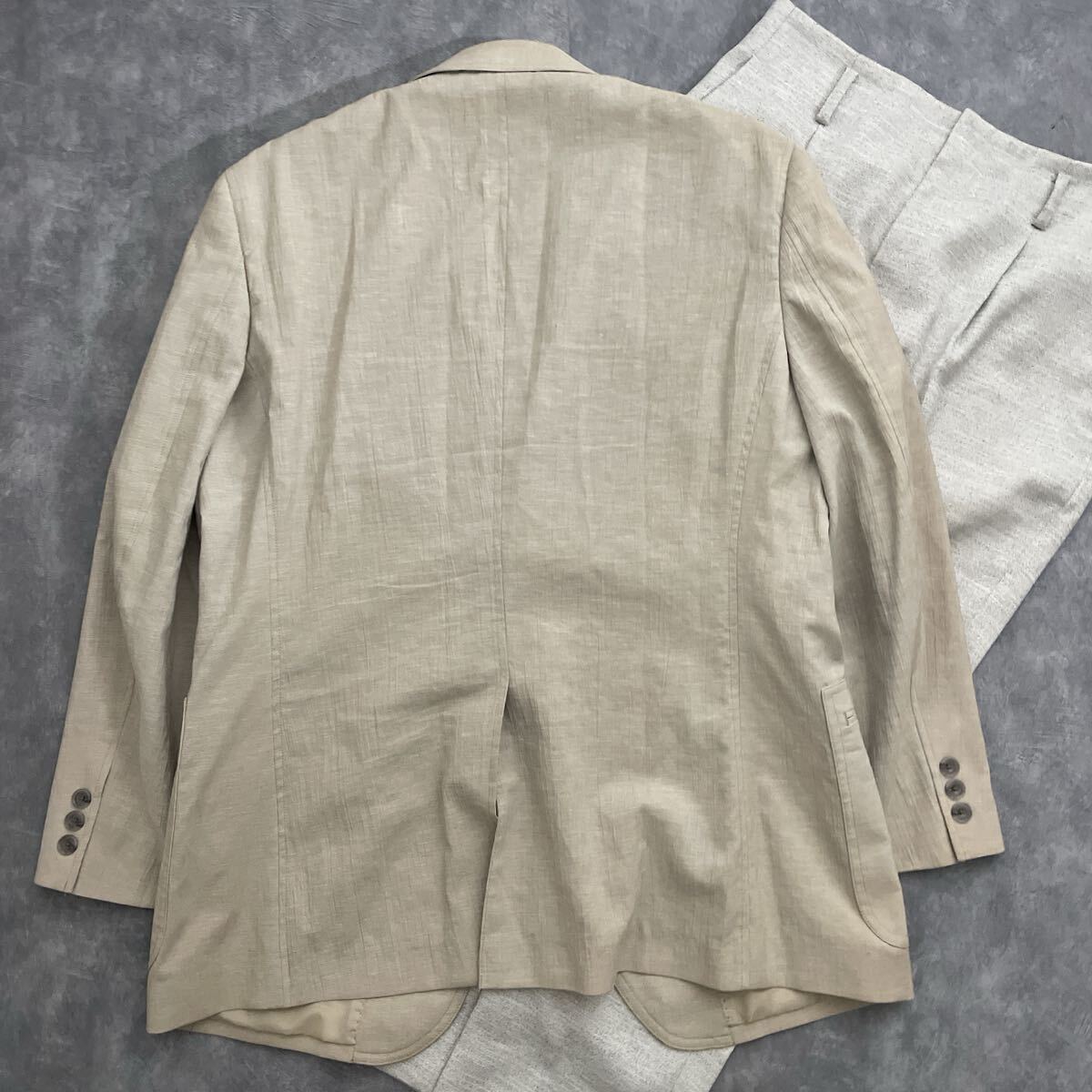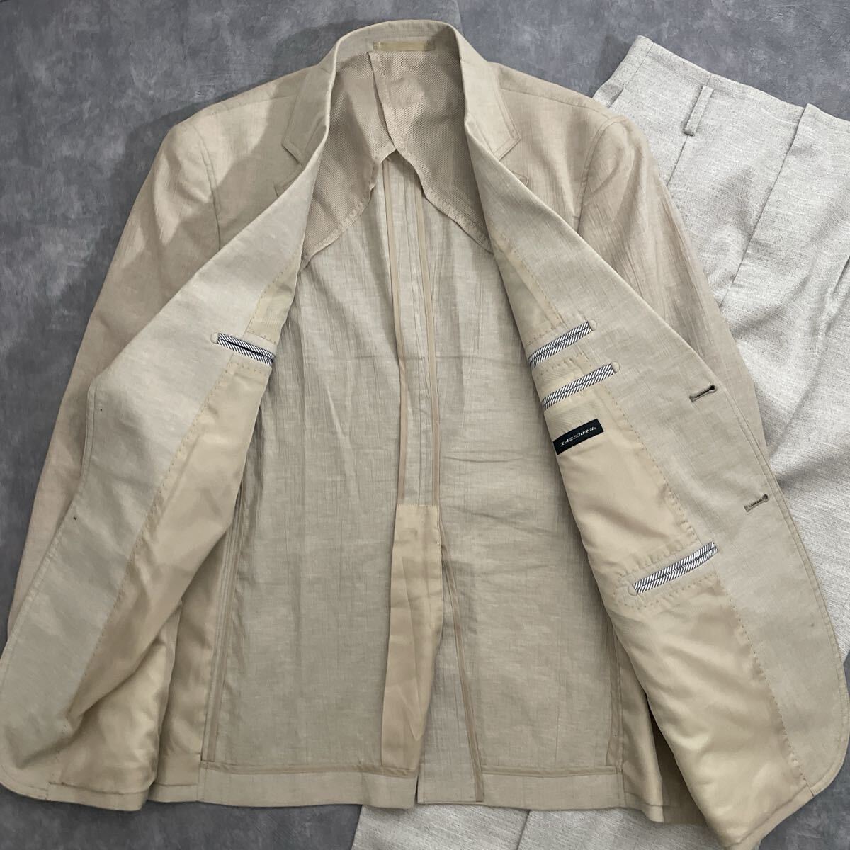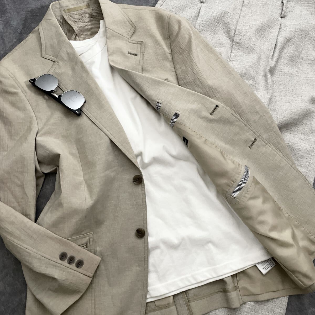 備考:清涼感のあるベージュ系のジャケット。ポリエステルに綿・麻をブレンドした生地で、軽やかさと通気性を兼ね備えています。