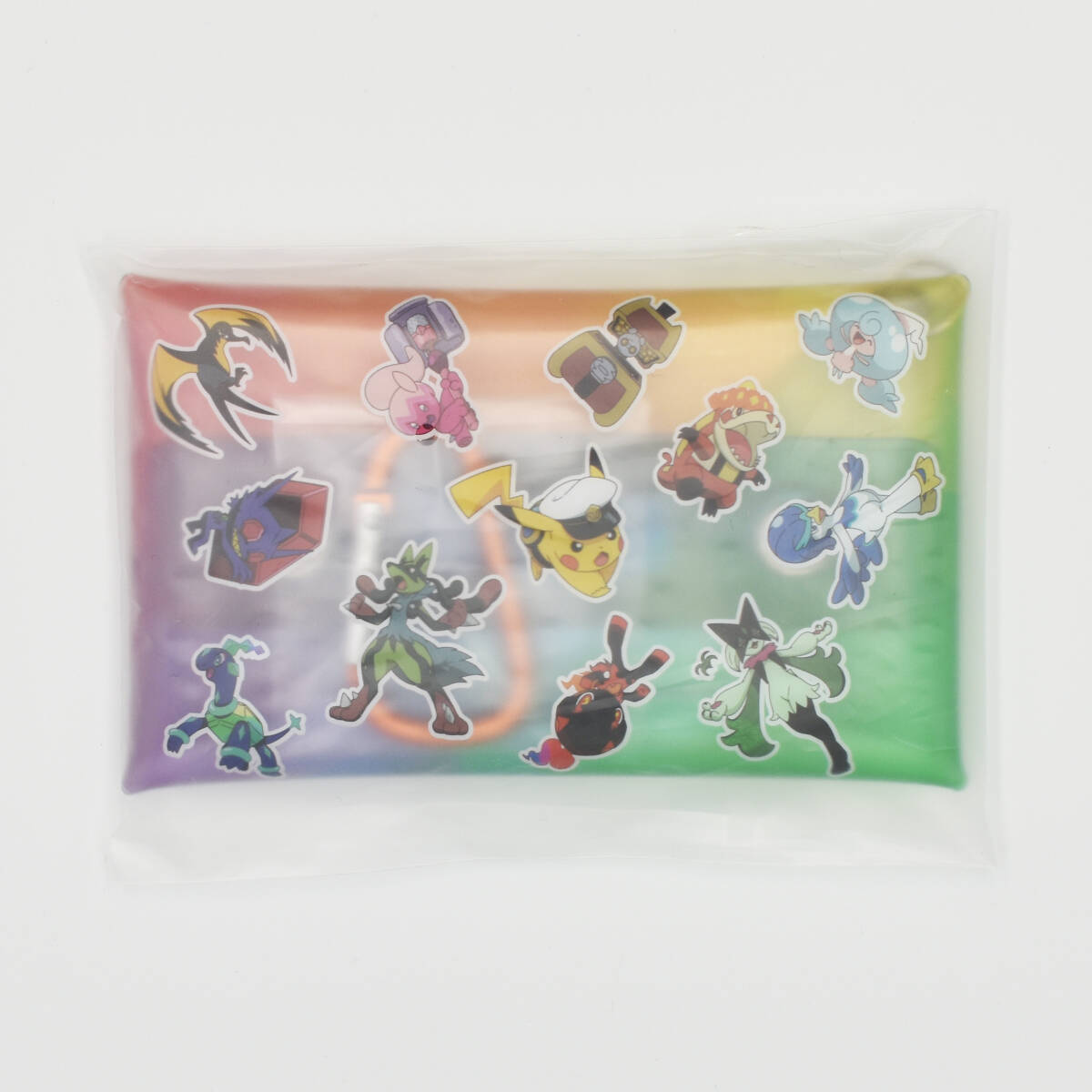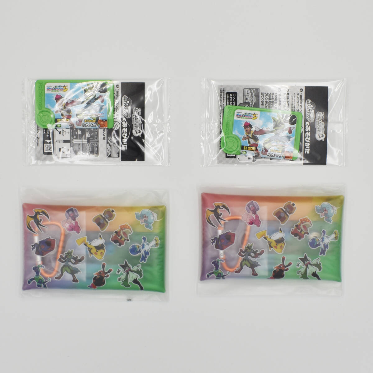 黄色いメガルカリオのフレンダピックと、ポケモンたちがデザインされたスペシャルクリアマルチケースの2点が2組セットになっています。