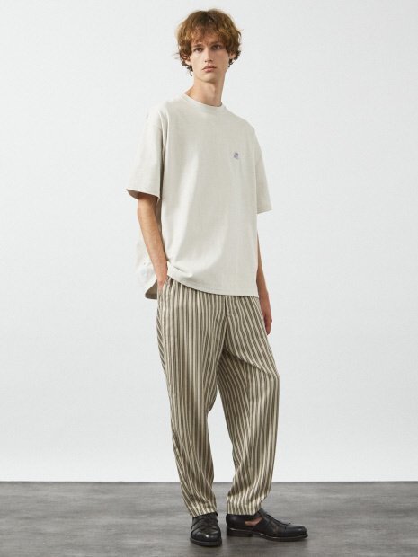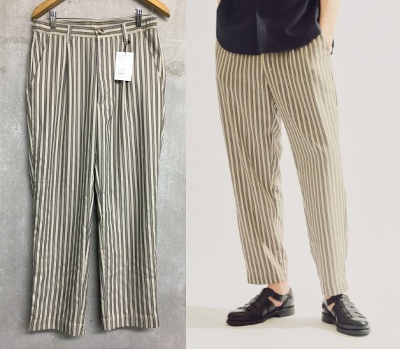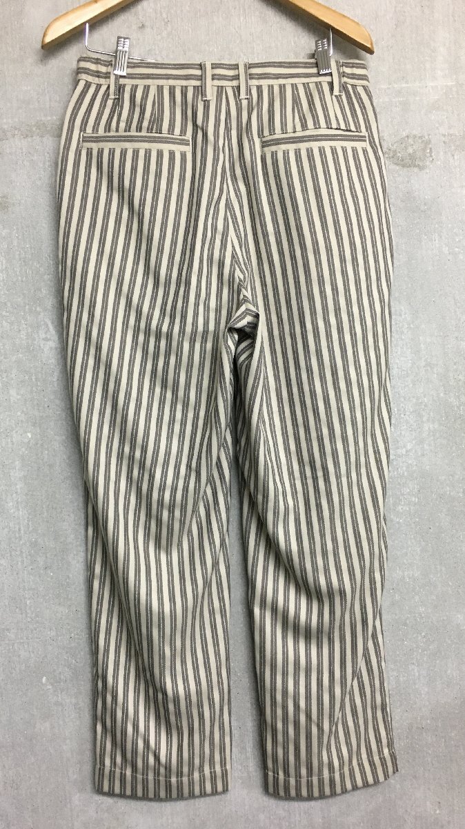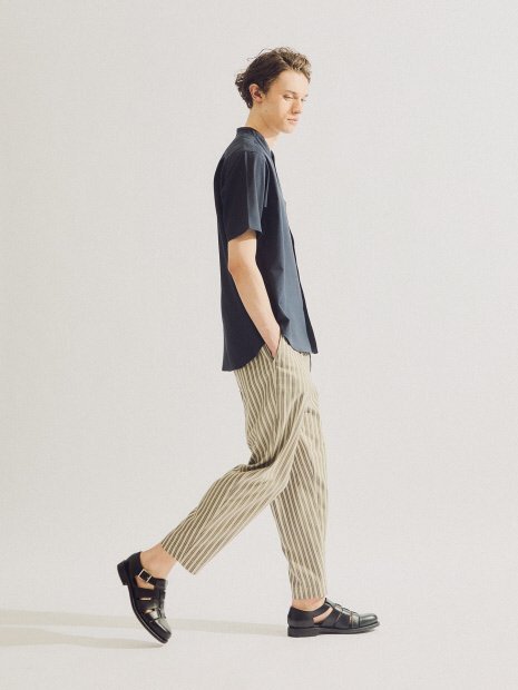 ナチュラルな雰囲気のストライプパンツ。ワタリに余裕のあるワイドテーパードシルエットです。