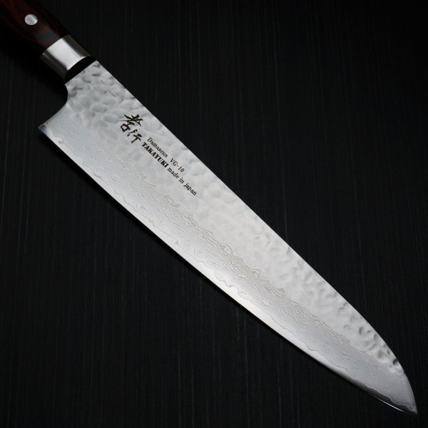 心材の刃はV金10号が使用されています。一般的にモリブデン鋼・モリブデン・バナジウム鋼・特殊鋼・硬質ステンレス・特殊ステンレスと記載されているものよりも高級な材質です。この材質はモリブデン、バナジウムだけでなくコバルトも含まれており、耐摩耗性、靭性、硬度の点で刃物鋼としての最適な条件を備えた高級ステンレス刃物鋼で、プロも使用しています。ステンレスですので、ステンレスではない包丁のように錆を気にする必要がありません。モリブデンとバナジウムが添加された医療用メスがよく切れるのはよく知られていますが、さらにコバルトが添加されているため鋭い切れ味がさらに持続します。つまり研ぐ回数を減らしてくれますので、メンテナンスが容易です。また槌目仕様は食材の切離れを良くしますので、お料理がスムーズに運びます。