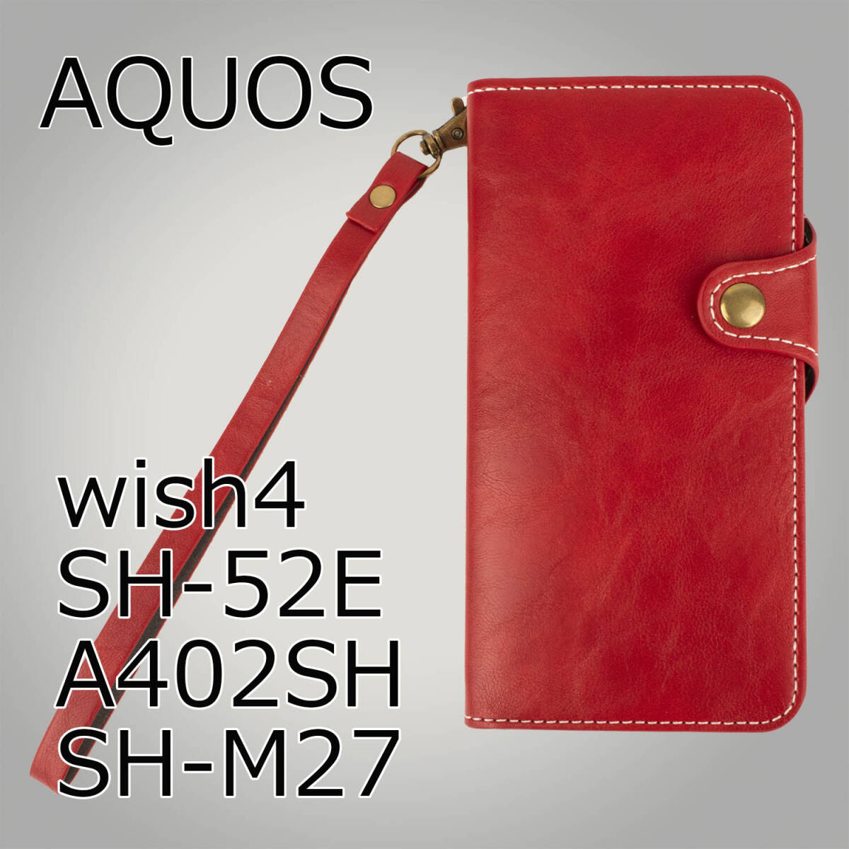 AQUOS wish4 ケース 手帳型 おしゃれ SH52E A402SH SHM27 カバー シンプル 赤 レッド Red ボタン式 ストラップ レザー 革 送料無料 安い