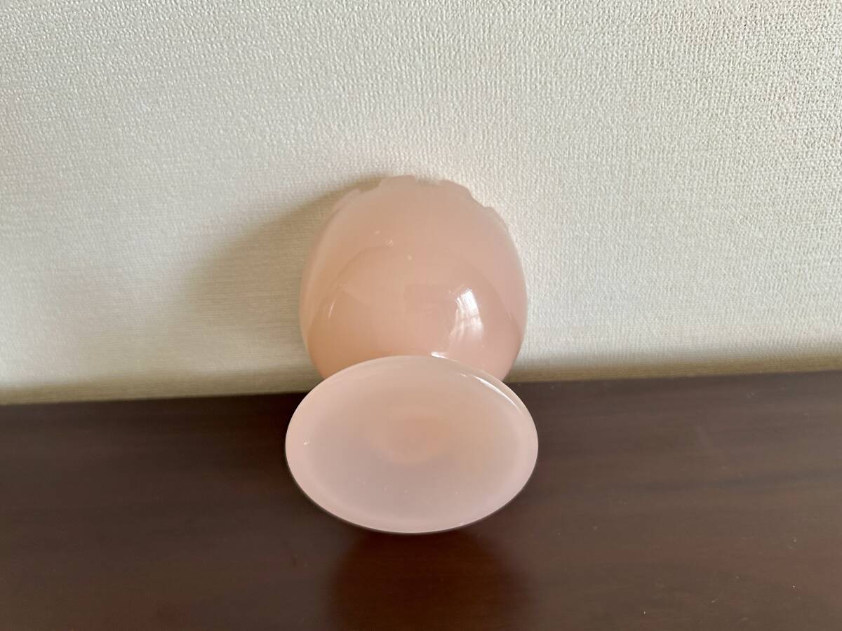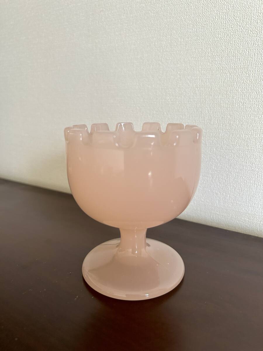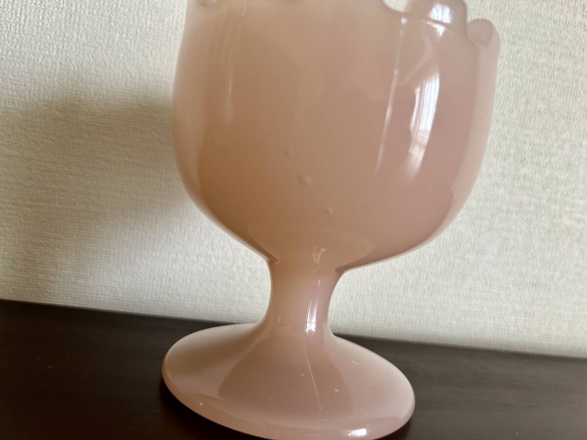 淡いピンクの分厚いミルクガラスにチューリップモチーフのデザインです。
