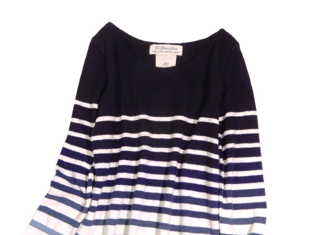 | レミレリーフ ニットトップス サイズ表記:F お色:ナチュラル系、ネイビー、ブルー等 素材: ウール54 コットン46% 平置き実寸で 肩幅37.5 身幅44 着丈72 袖丈56cm位です。 ボーダーのピッチ、カラーが裾にかけて美しく変化するニット。 ストレッチ性がありつつ、肌当たりの良い着心地、カジュアルな風合いがポイントです。 |