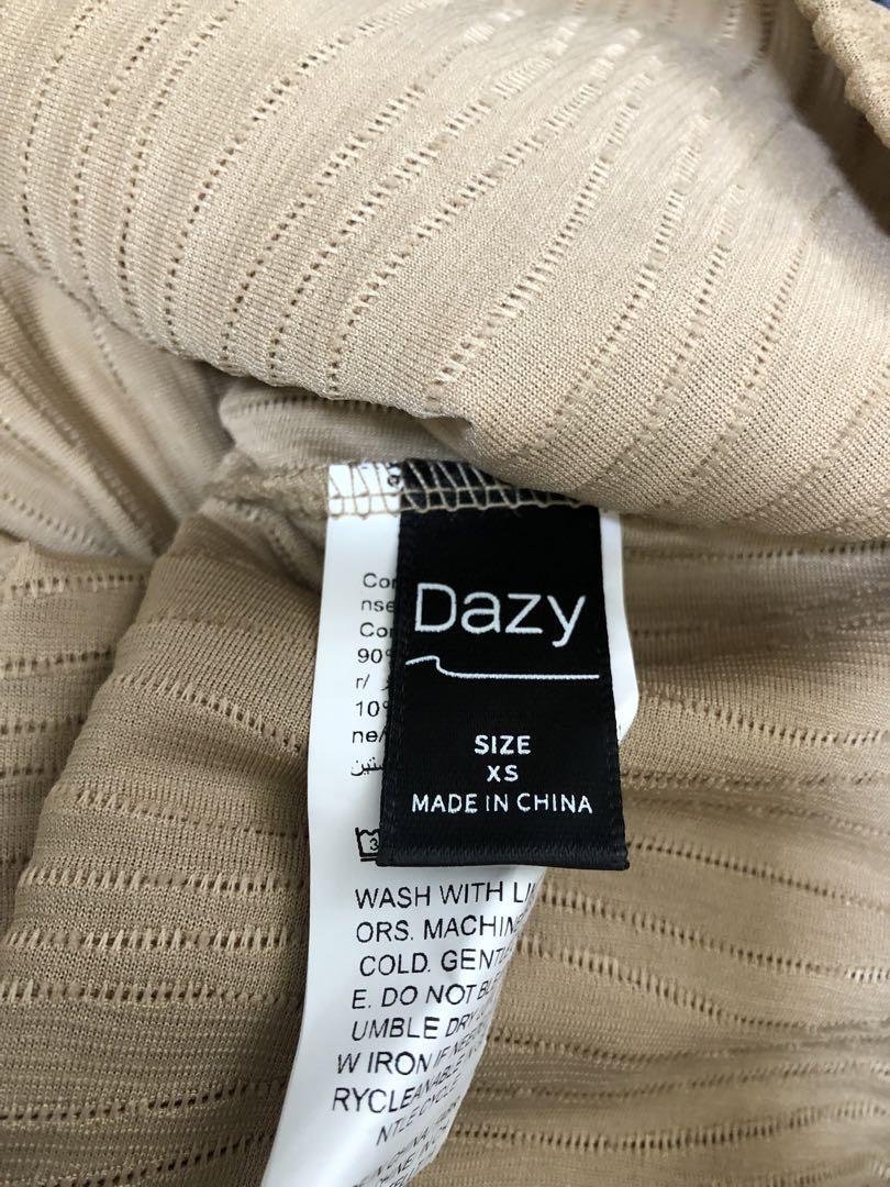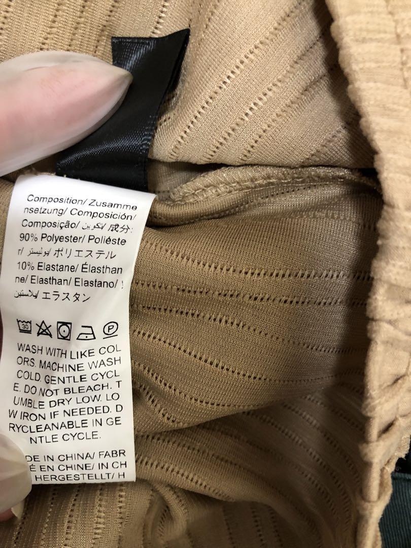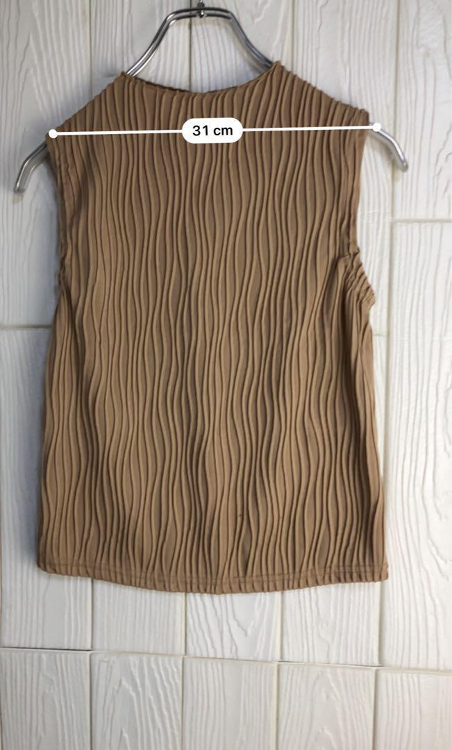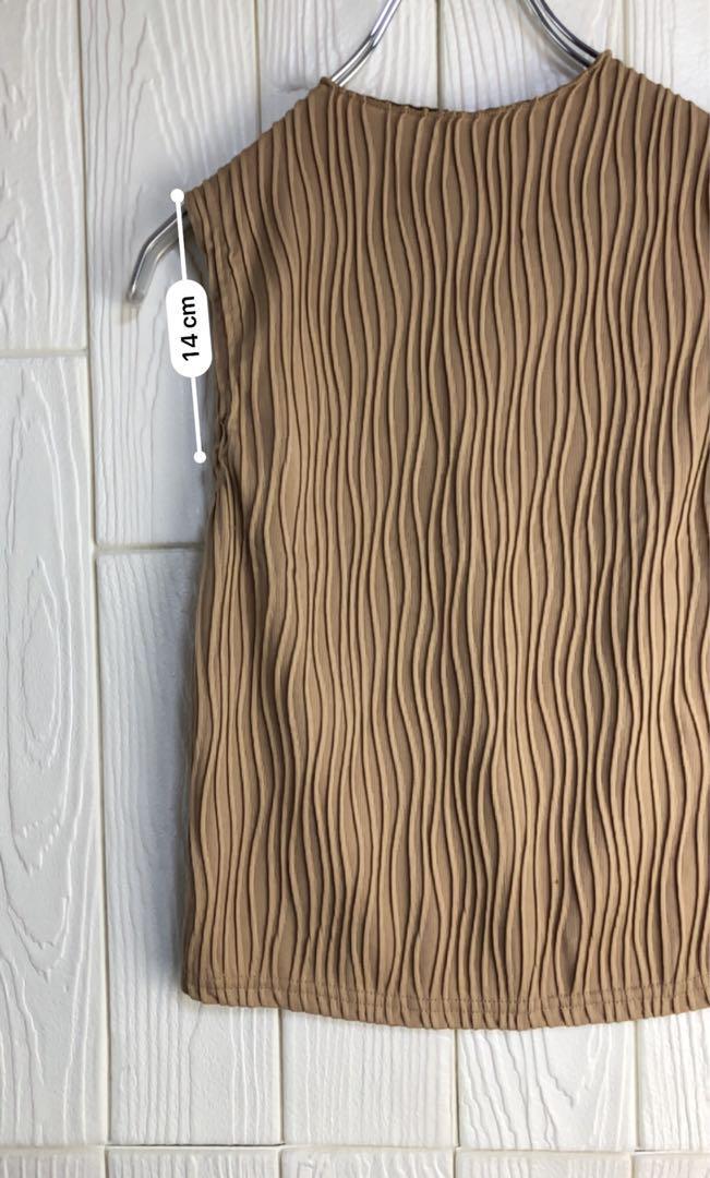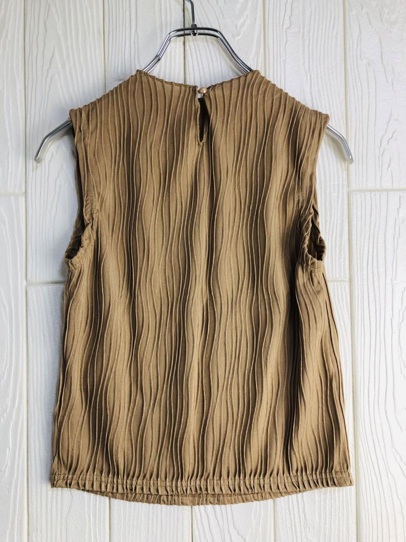 波状のプリーツデザインが特徴的なベージュのノースリーブシャツ。