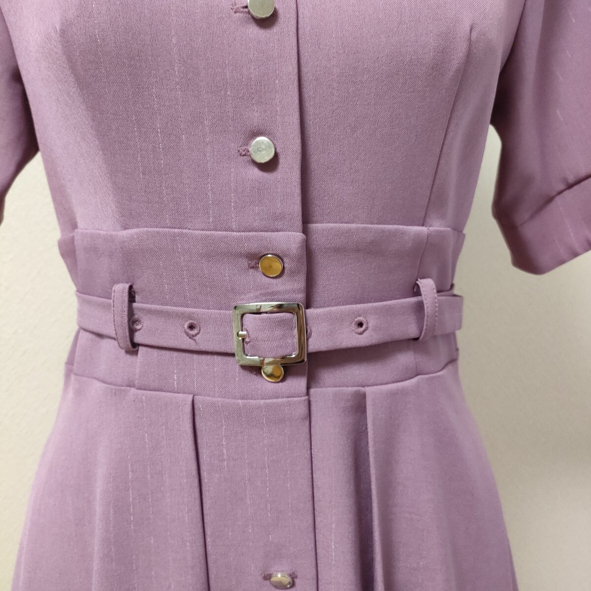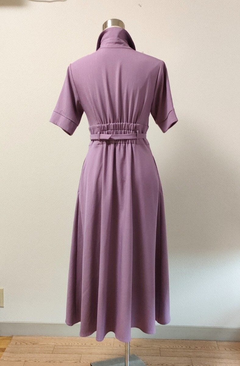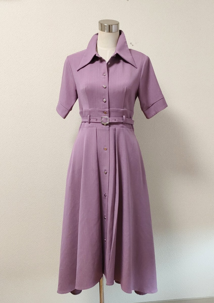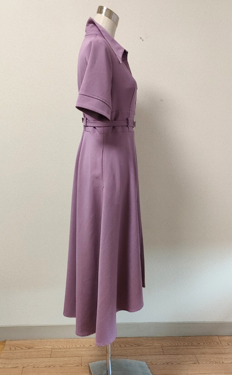 REDYAZEL(レディアゼル)の薄紫のシャツカラー半袖ロングワンピース、ウエストベルト付きでスタイリッシュ
