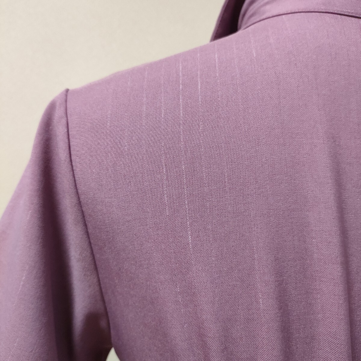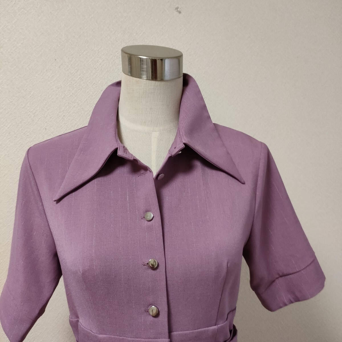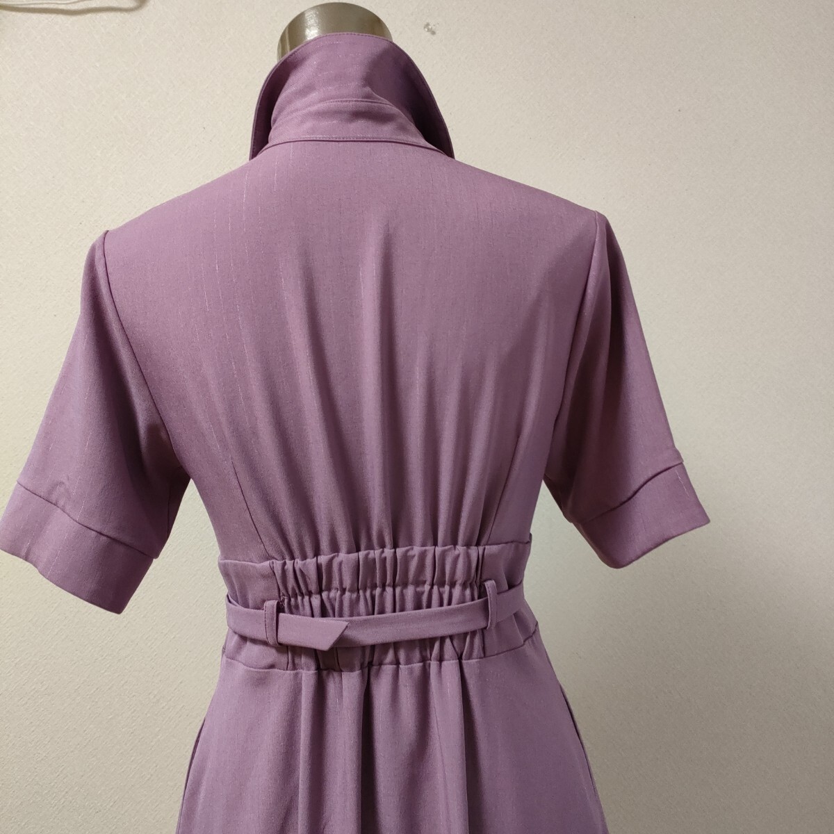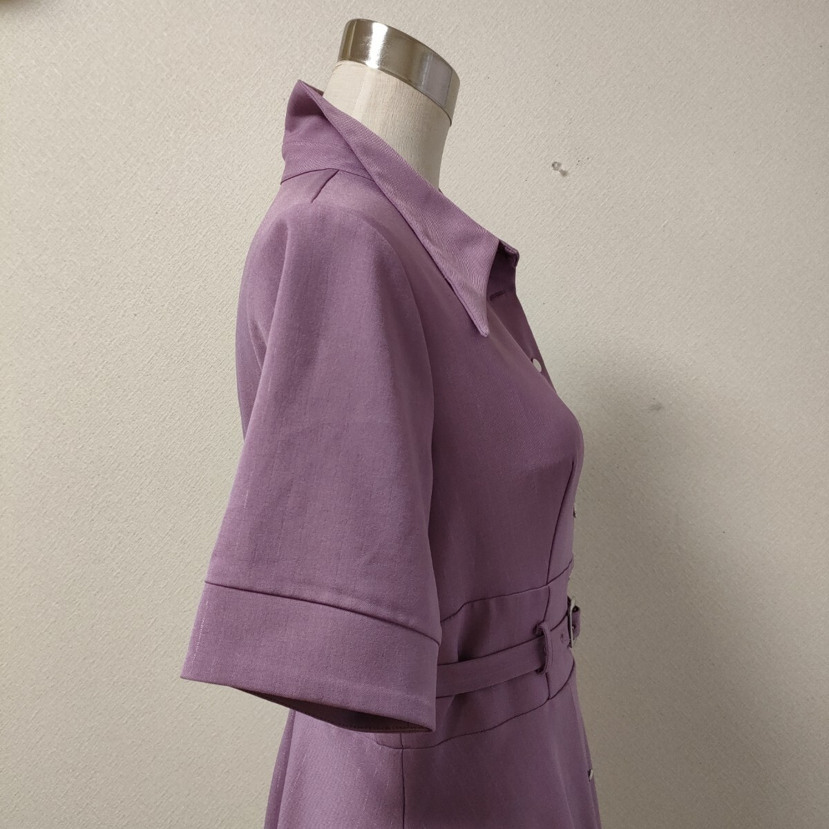 REDYAZEL(レディアゼル)の薄紫のシャツカラー半袖ロングワンピース、ウエストベルト付きでスタイリッシュ