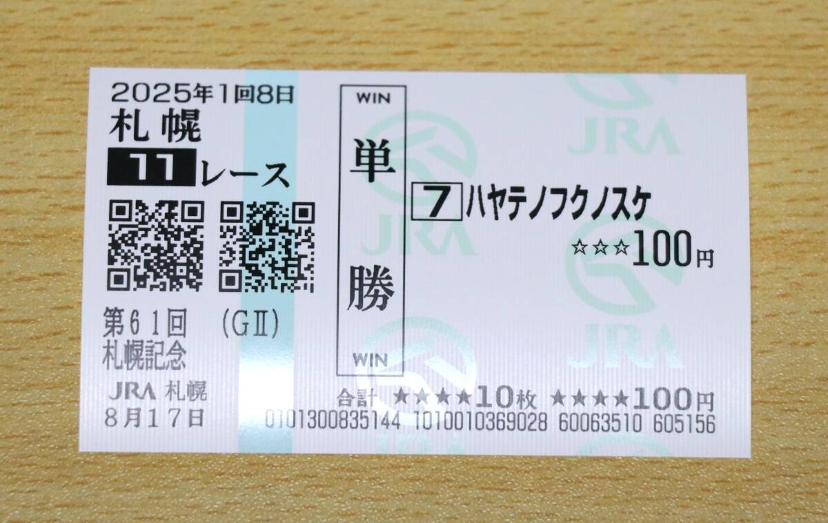 ハヤテノフクノスケ 札幌 11R 札幌記念 (2025年8/17) 現地単勝馬券(札幌競馬場)です。気に入って頂けた方の落札を心よりお待ちしております。 商品は定型郵便(110円)又は又はゆうパケットポストminiで発送となります。 厚さの関係上、定型郵便の場合は片面段ボール補強、ゆうパケットポストの場合は両面段ボール補強となります。どうかよろしくお願い致します。