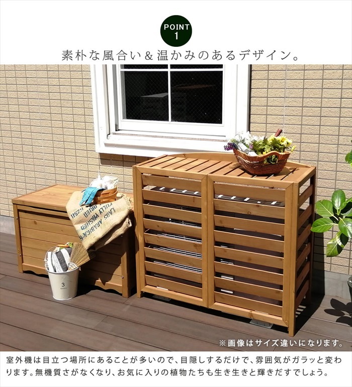 | ナチュラルスタイルのお庭づくりに。 どうしても生活感がにじみ出てしまうエアコン室外機は、おしゃれな室外機カバーで、目隠ししてしまいましょう。 天然素材の室外機カバーなら、センスのいいお庭にイメージチェンジできるだけでなく、上にプランターやガーデニング用品が置けるので、デッドスペースだった空間を有効活用できます。 広めの板幅で熱がこもりにくいだけでなく、板を上向きにすることで、周囲のグリーンに熱風が当たらないよう工夫しました。 直射日光が当たる位置に室外機があるなら、室外機カバーで日陰を作ることで、節電効果も期待できます。 |