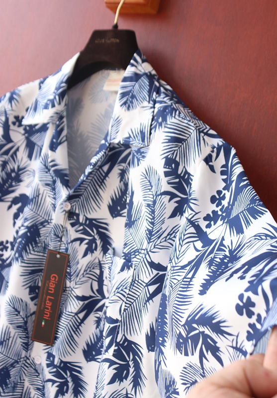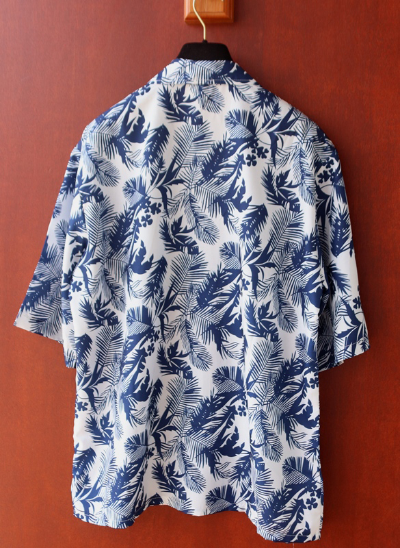 オープンカラーにヤシリーフ柄の夏らしいアロハスタイル、