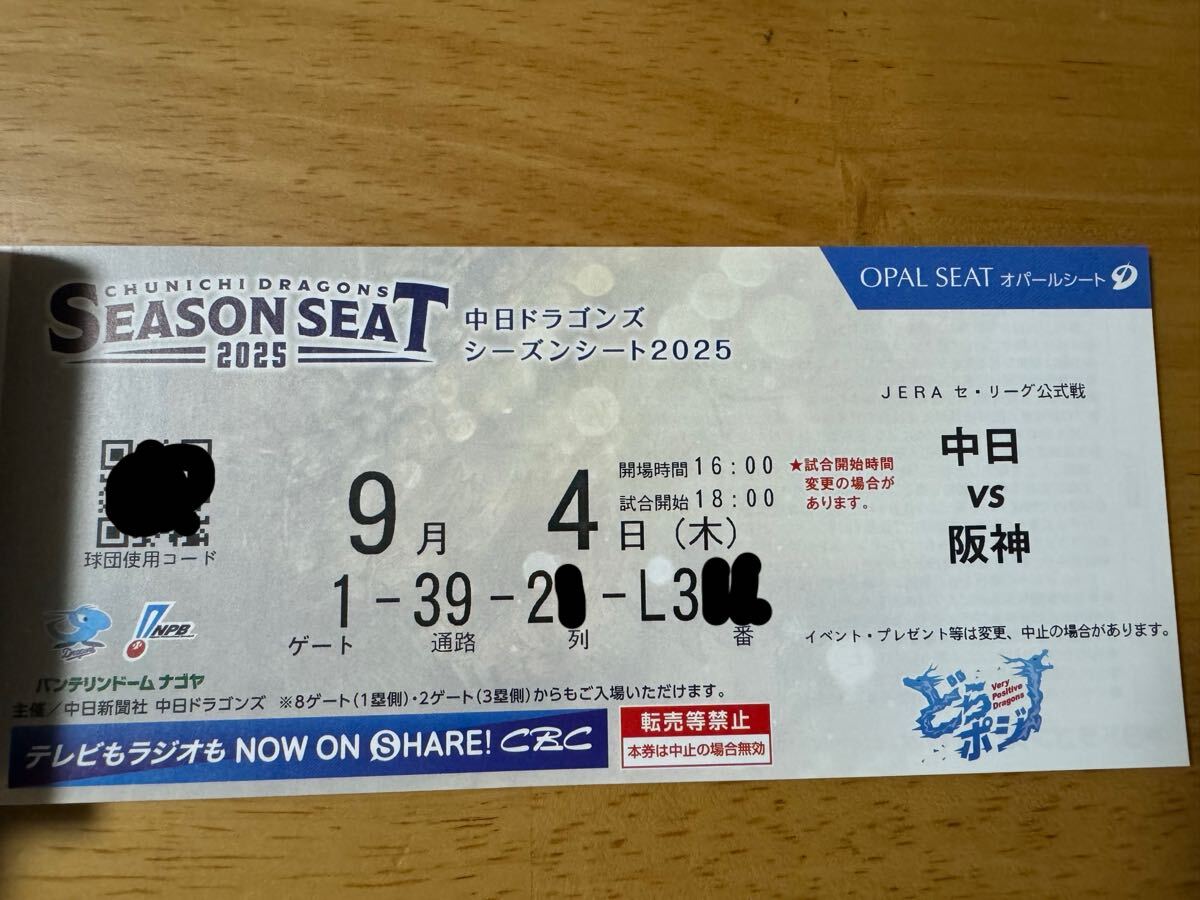 席番号、列番号、2次元コード、バーコードは隠しております。予めご了承ください。