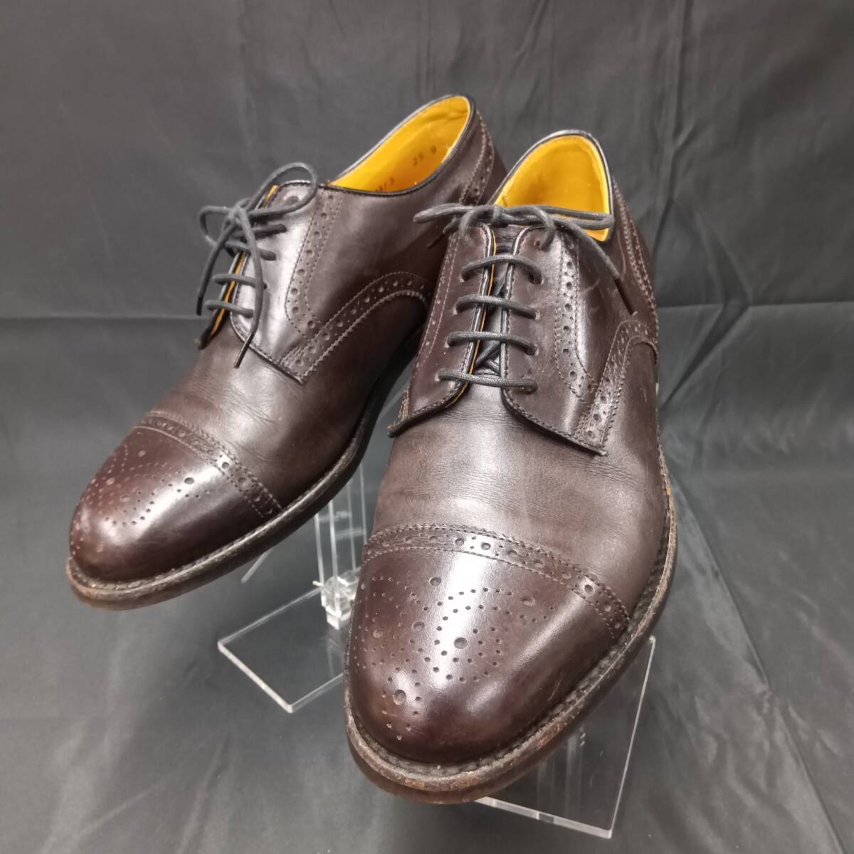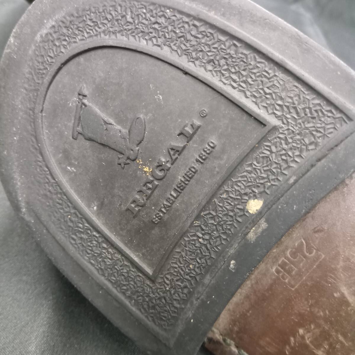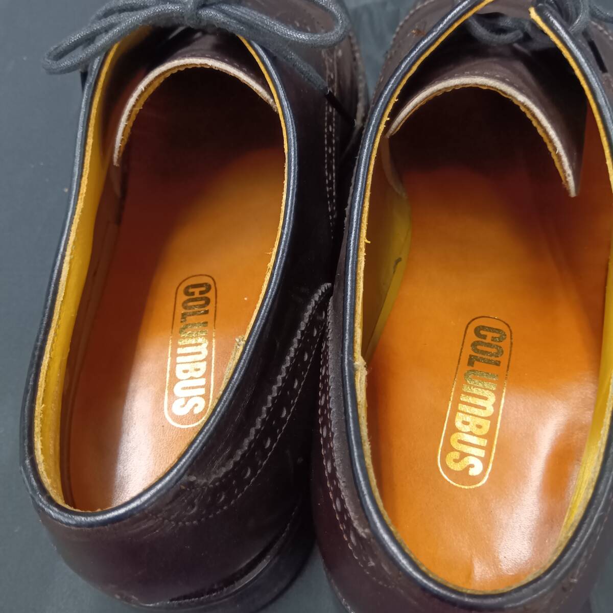Columbus(コロンブス)製のメンズレザーオックスフォード靴です。モデル番号はJM/3、製造番号はA9F5088。日本のブランドとして知られ、しっかりと作られた革靴で、シンプルながらも内羽根式のクラシックな意匠が魅力です。インソールには“COLUMBUS”のロゴ、ヒールには“REGAL”のブランド名(ヒールラバー刻印)が見受けられます。サイズ表示は「25g」とあり、ジャストサイズ日本製の表記がないため、詳細不明な点はご了承ください。全体的には使用感がありますが、革の雰囲気は残っており、今後のお手入れで風合いがより引き立つかと思います。