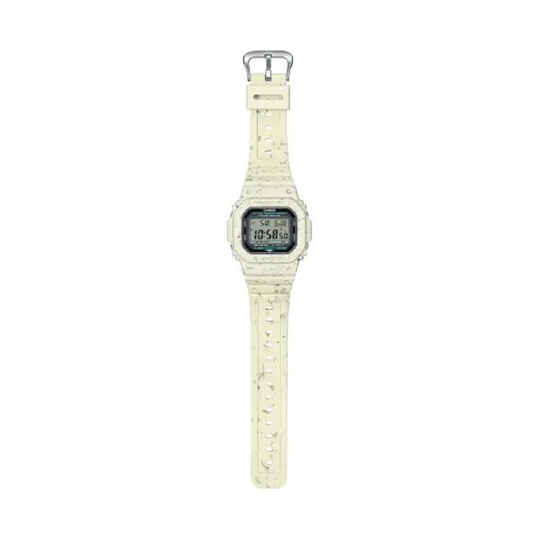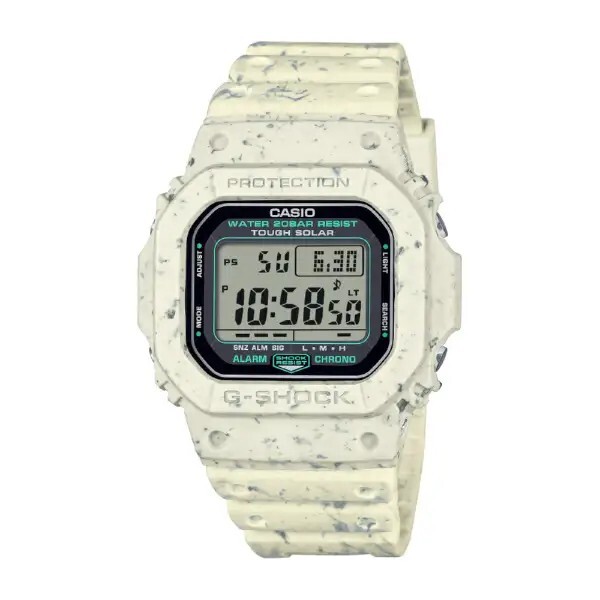 1983年の発売以来、飽くなき強さを求めて進化を続けるタフネスウオッチG-SHOCKから、環境をテーマに取り組むため、製造過程で出る廃棄樹脂をリサイクル使用したモデルです。 パーツの製造過程で出る廃棄樹脂を粉砕加工し、練り込んだ樹脂をベゼルやバンドに採用。ベースカラーのベージュに、ホワイトとオリーブグリーンの廃棄樹脂を混ぜ込み、独特のパターンを作り上げました。普段使いでも、ファッションシーンでも幅広く活用できるデザインです。 ベースモデルには、蛍光灯のわずかな光でも発電するタフソーラーを搭載したG-5600を採用し、廃棄樹脂を再活用したベゼルとバンドで、環境負荷低減に貢献することが期待されています。環境に配慮した素材や機能で自然との共生をカタチにしたG-SHOCKです。 ※製品の特性上、製品ごとおよび部品ごとに個体差がございます。
