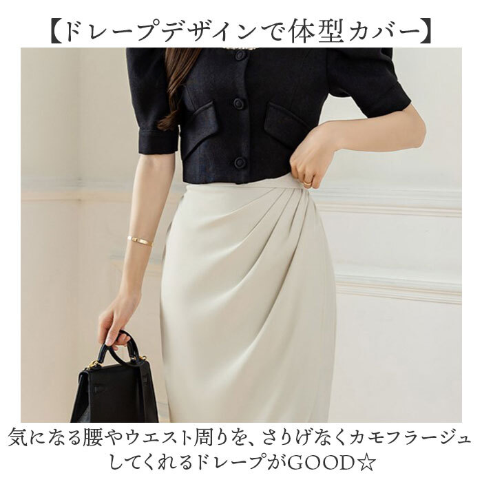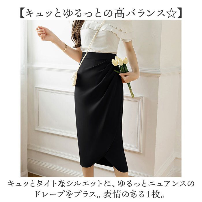 | 商品説明 | ・・【タイト×ドレープのこなれスカート】 ・大人っぽくキメたい日にぴったりの「ドレープスカート ミディ丈」が登場。 ・【キュッとゆるっとの高バランス☆】 ・キュッとタイトなシルエットに、ゆるっとニュアンスのドレープをプラス。表情のある1枚。 ・【ドレープデザインで体型カバー】 ・気になる腰やウエスト周りを、さりげなくカモフラージュしてくれるドレープがGOOD☆ ・【巻きスカート風のスリット】 ・巻きスカートのようにくるっと重なるスカートで、優しいスリットをON。美脚魅せを叶える♪ ・【大人っぽいミディ丈がポイント】 ・膝が隠れるミディ丈で好印象!上品さのある丈感が大人にぴったり!オフィスなどにも◎ |