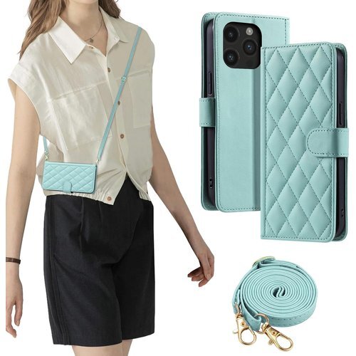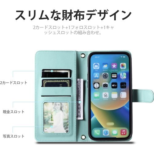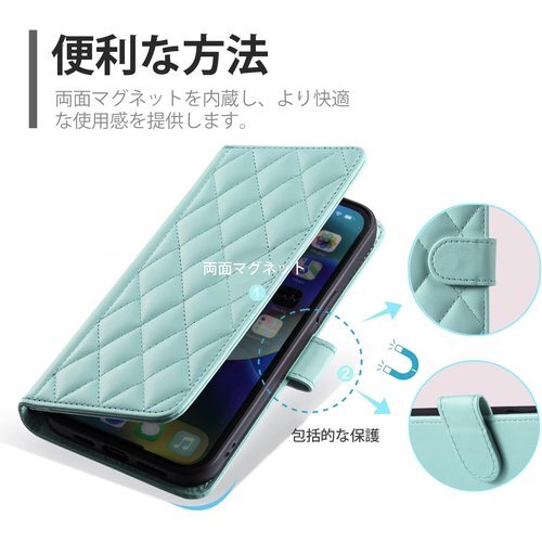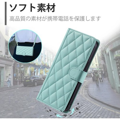 laddutoi FOR いphone14pro max ケース iphone 14 pro max ケース 手帳型 おしゃれ ストラップ付き スタンド機能 カード収納 軽量 薄型 耐衝撃 高級PUレザー 滑り防止 財布型 内蔵マグネット 開閉式 チェック柄 上質 耐摩擦 マグネット式 肩掛け 斜め掛けーミントグリーン 2661
