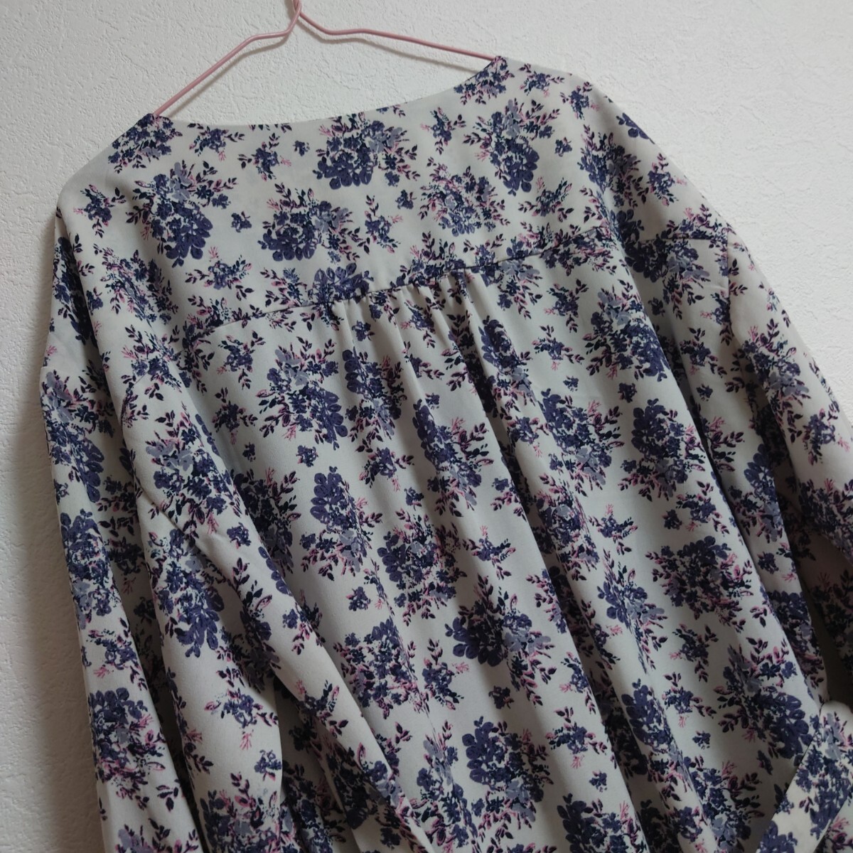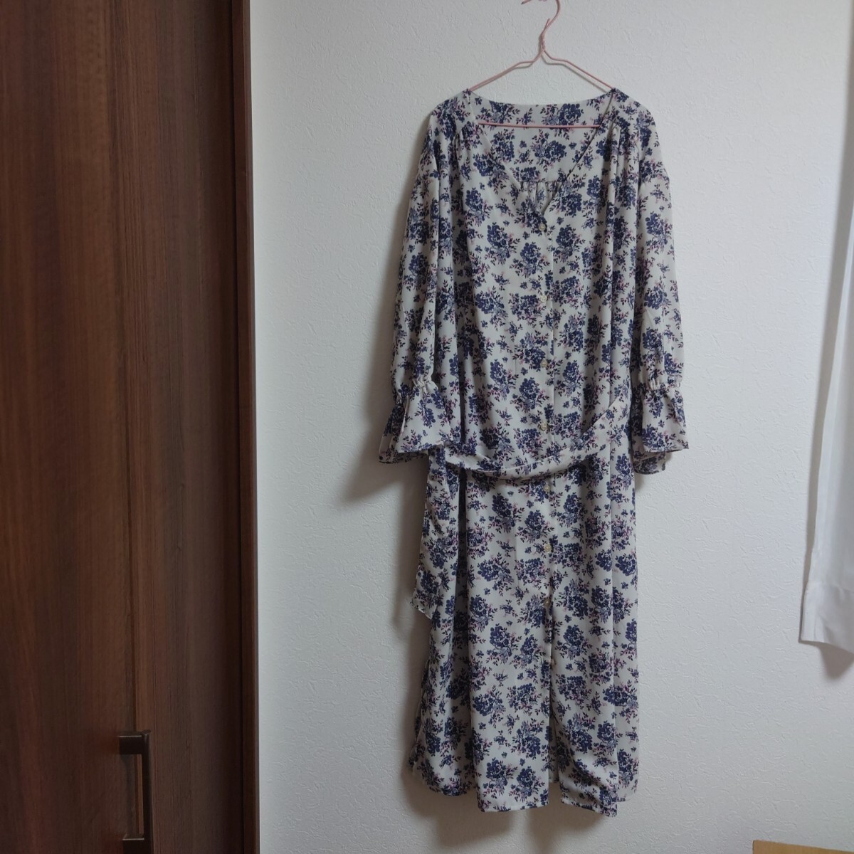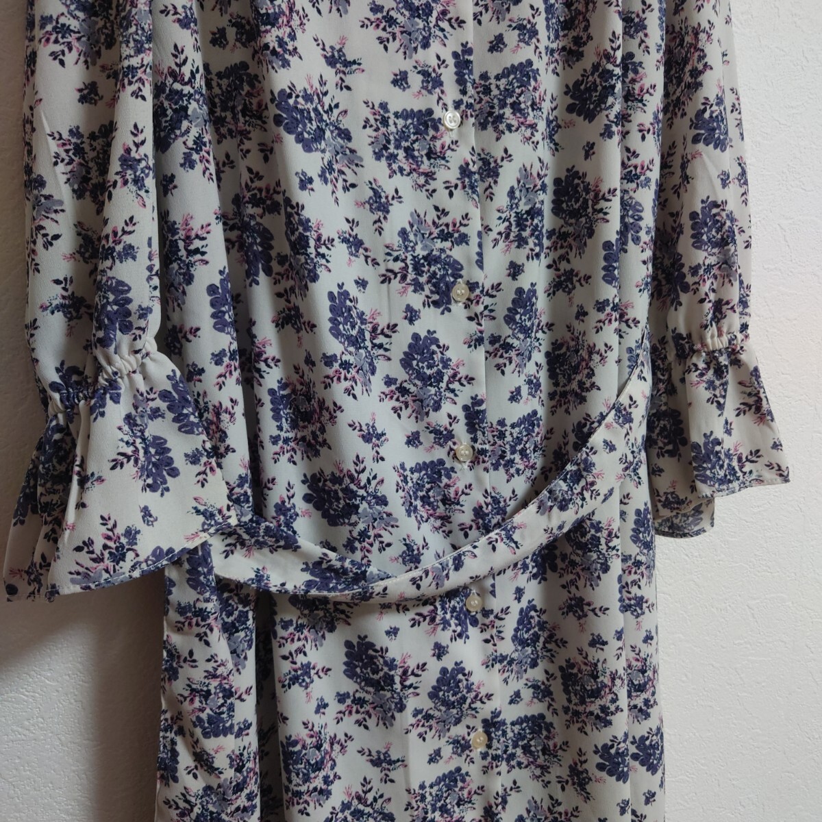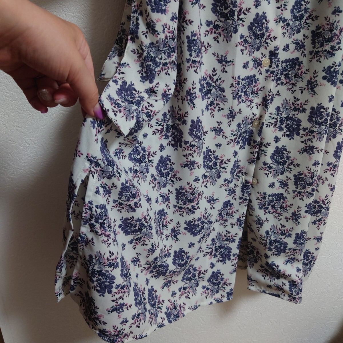 GUのMサイズ、フラワープリントの長袖シャツワンピース。