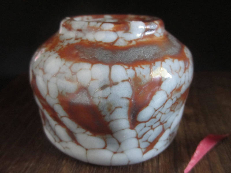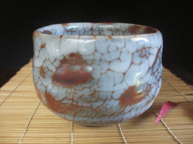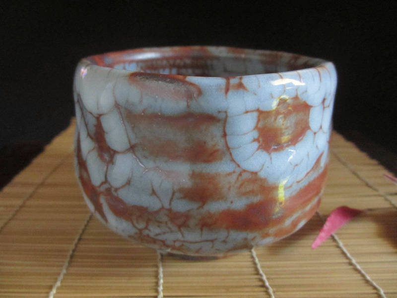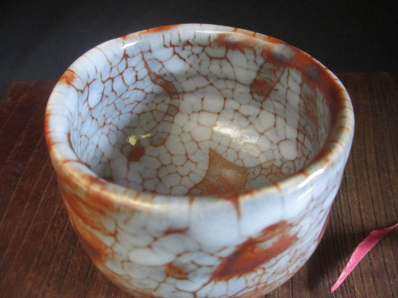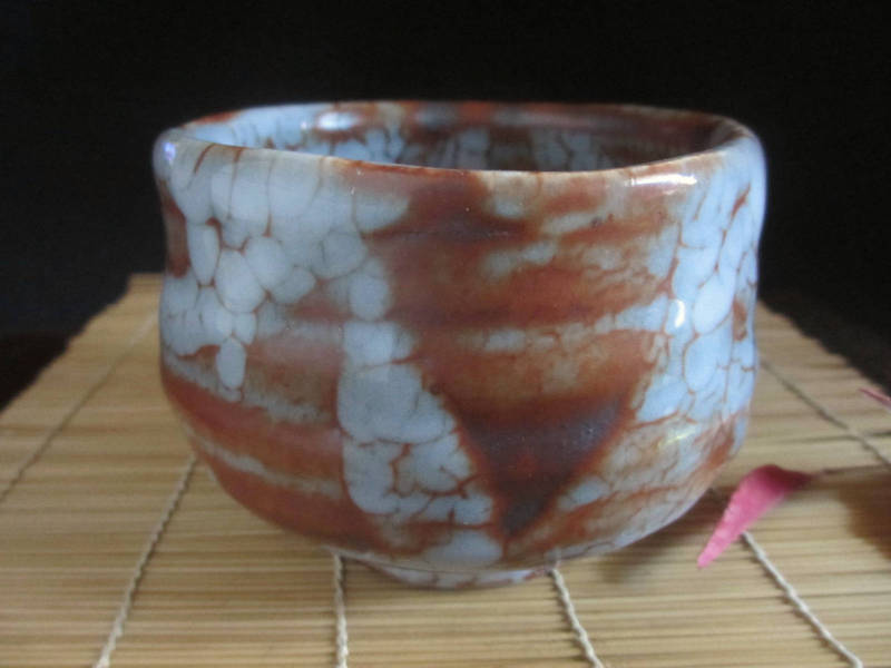 艶やかな朱色に梅花皮の景色が魅力の旅茶碗。
