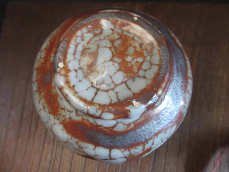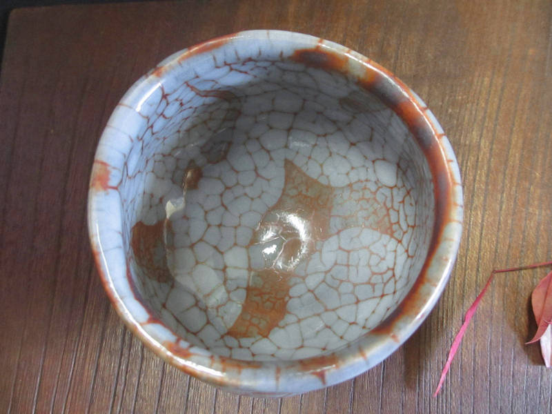 光沢のある表面に、梅花皮の複雑な色や意匠が絡み合った景色。しっくり手に馴染むろくろ目の優しい凹凸。