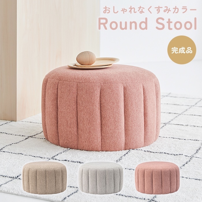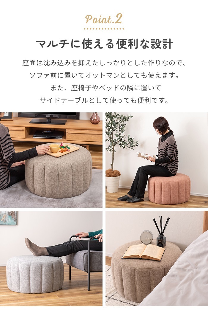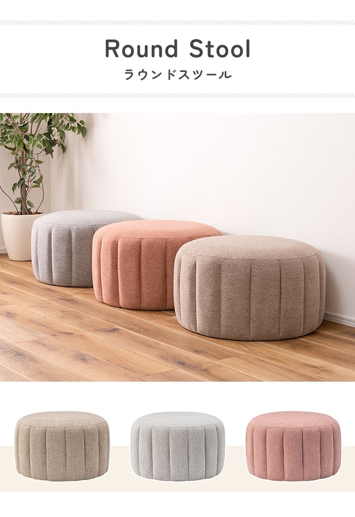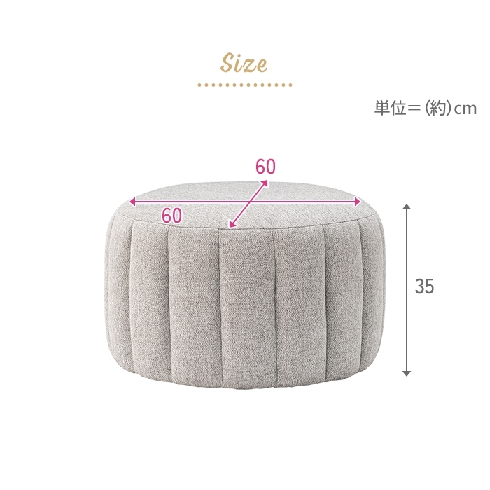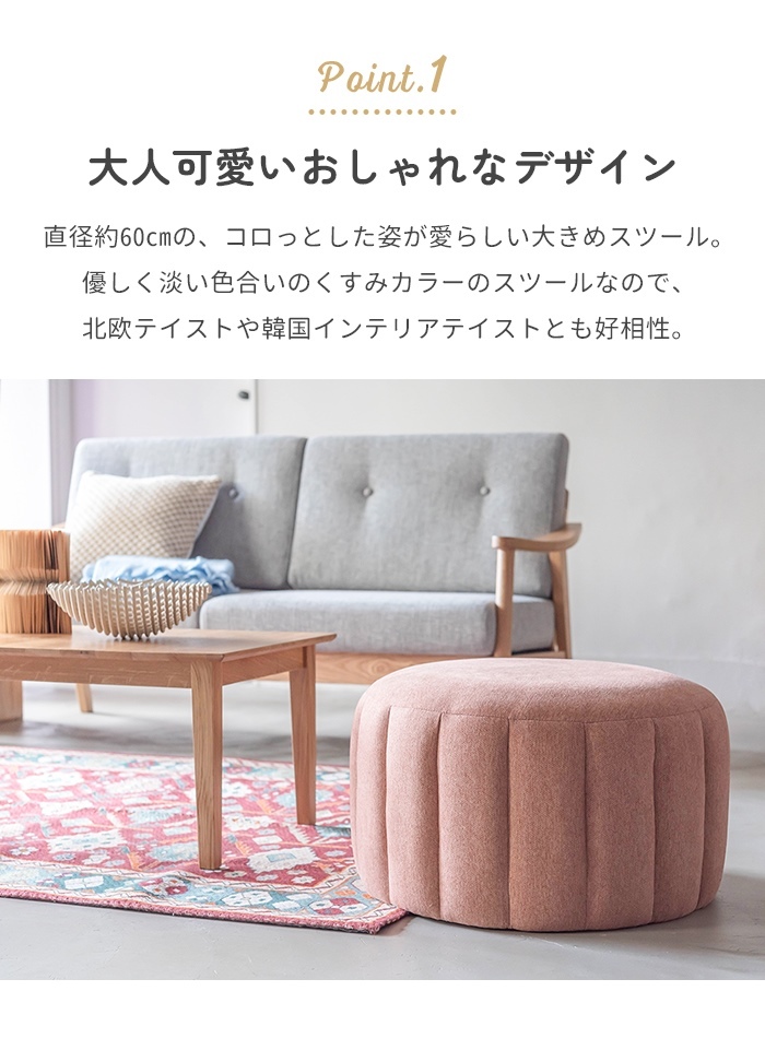 | 直径約60cmの、コロっとした姿が愛らしい大きめスツール。 優しく淡い色合いのくすみカラーのスツールなので、北欧テイストや韓国インテリアテイストとも好相性。 大きめサイズなのでお部屋の中でもちょっと目を引くワンポイントデザインになります。 座面は沈み込みを抑えたしっかりとした作りなので、ソファ前に置いてオットマンとしても使えます。 また、座椅子やベッドの隣に置いてサイドテーブルとして使っても便利。 |
