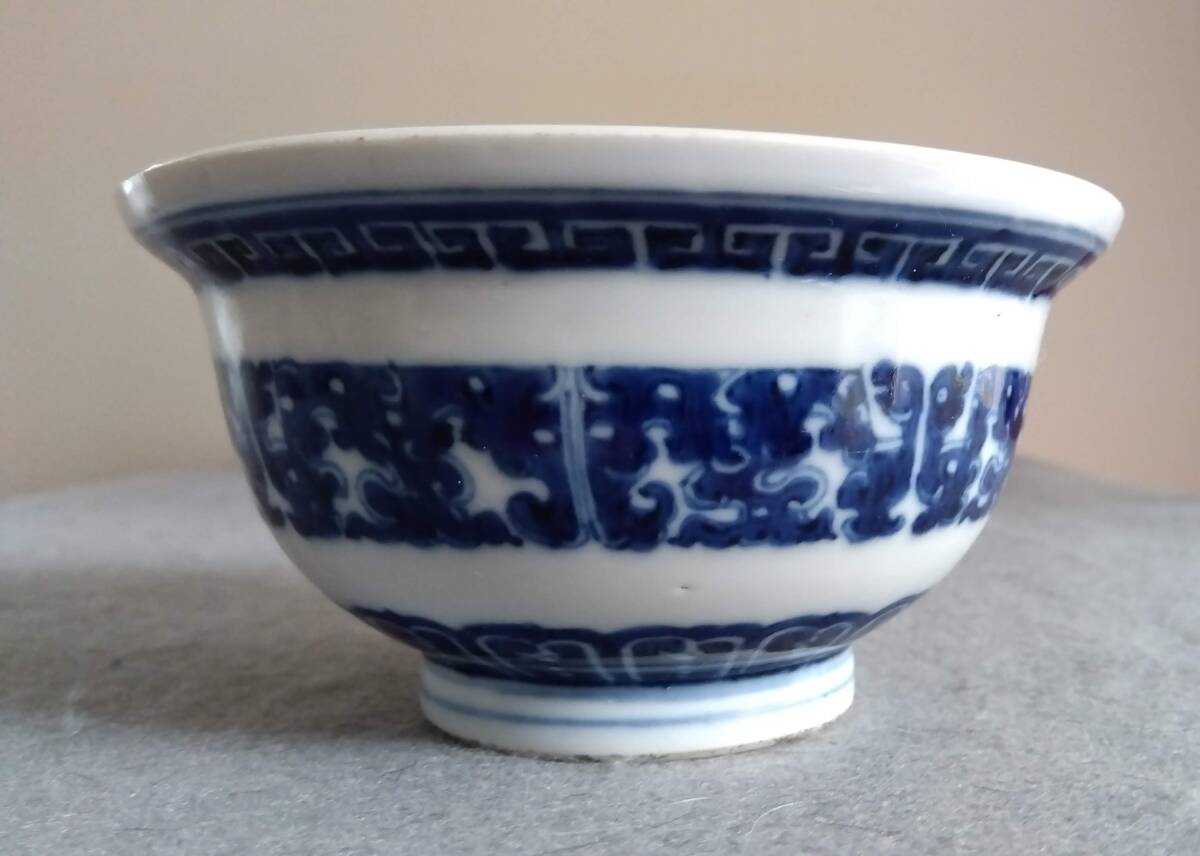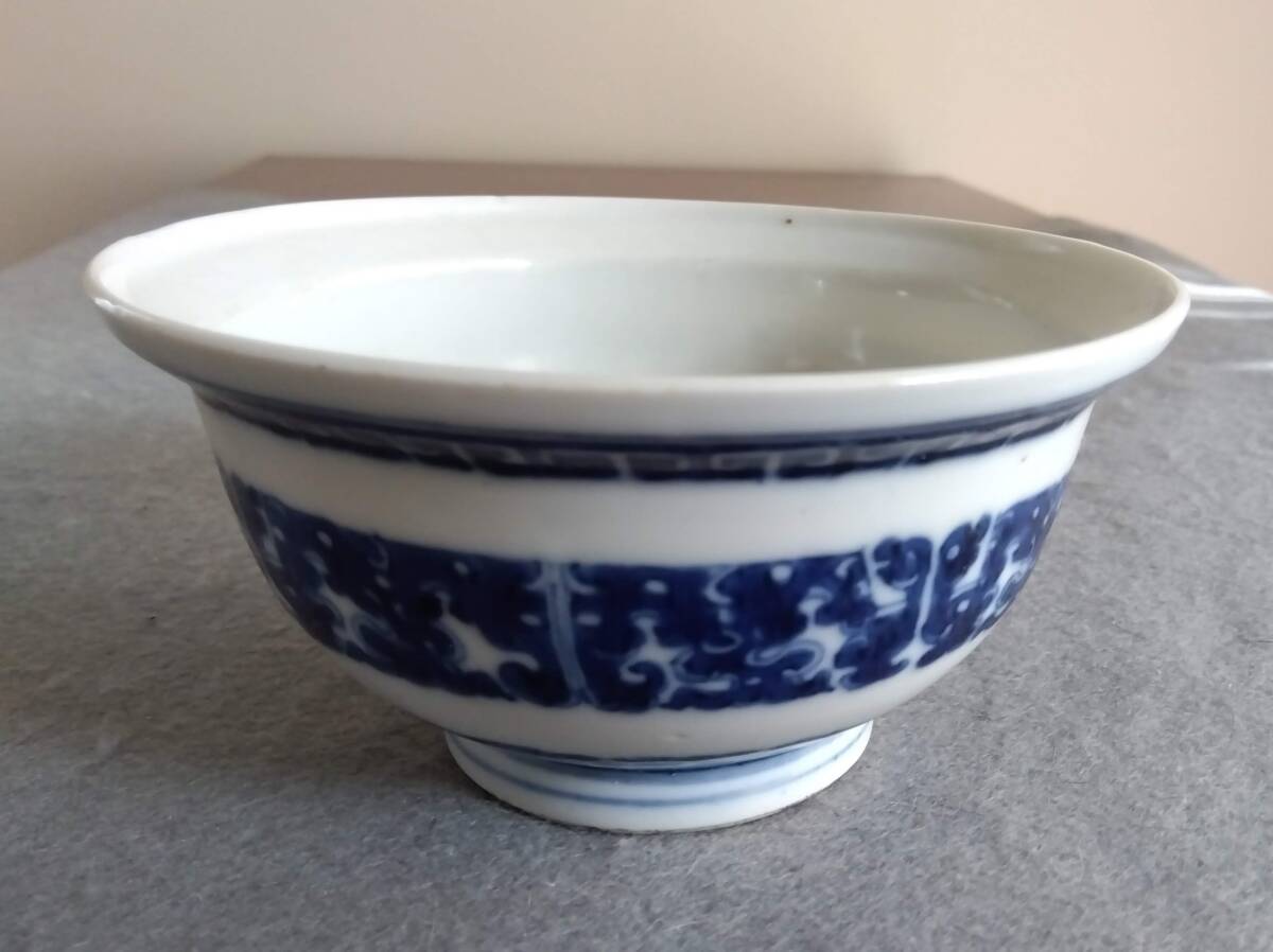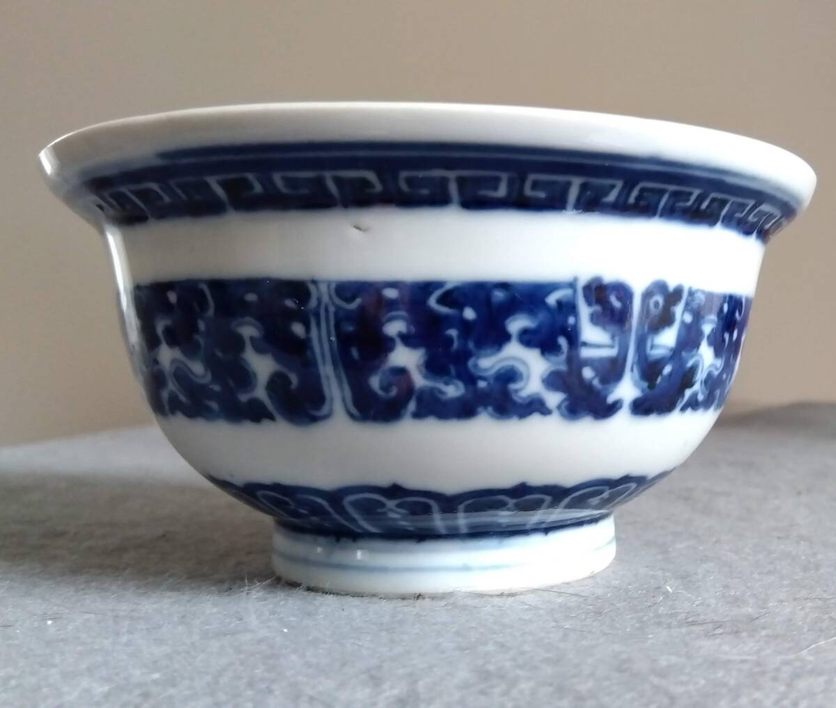 中國古陶磁器 清朝年製 青花鉢 宣徳窯30数年昔景徳鎮を訪れた時工芸品古物商店で 器見込み部及び腰胴全体に彩る見事な青花紋様釉美を気に入り買い求めたお逸品です。 画像参照でご理解頂ける様に中國国家工芸局総公司の本物保証の印が高台底にふされています。 清朝以前の品物売買は国が禁止しているとの店主の説明で 本物である安心感をもって買い求めたものです。 当時は化粧箱もなく新聞紙に雑に包まれ持ち帰ったことが懐かしく思い出されます。サイズ:玉縁口縁2mm口径120mm見込み45mm全高60mm口台径55mm高台底高X幅X深10X2X10mm包装:クラフトボックスプチプチ包装
