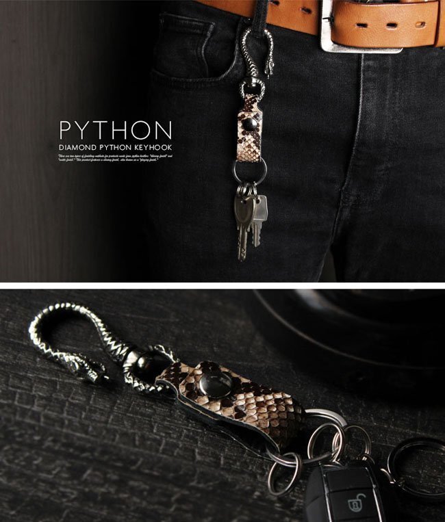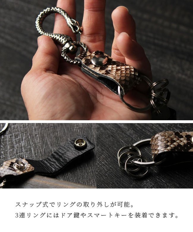 本物のパイソン(蛇革)を使用したキーホルダーです。リアルに蛇を再現したフックがクールでインパクト大です。 シャイニング加工で艶やかな光沢を放つパイソンを使用し、裏地には柔らかくしっとりとした姫路産のオイルシュリンクレザーを採用。 バッグやベルトループに付けるだけで存在感抜群。持っているだけで運気が上がりそうな、個性派キーホルダーです。