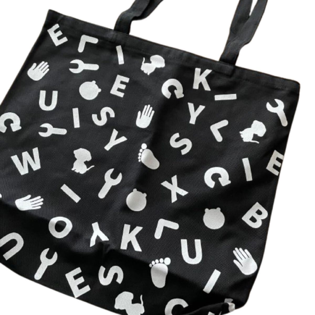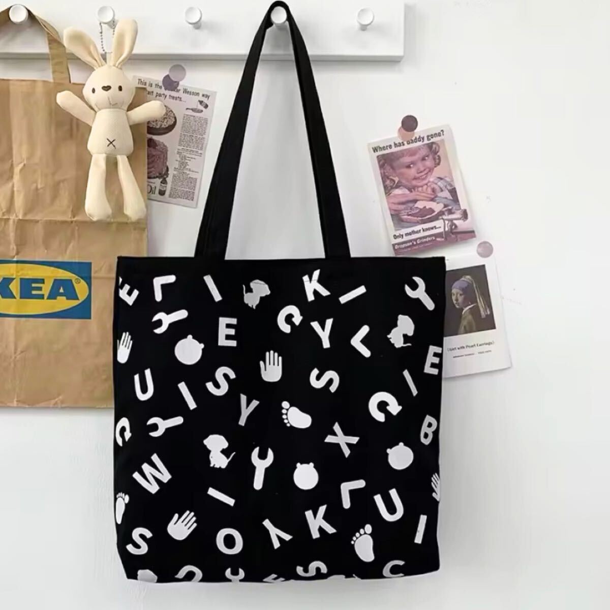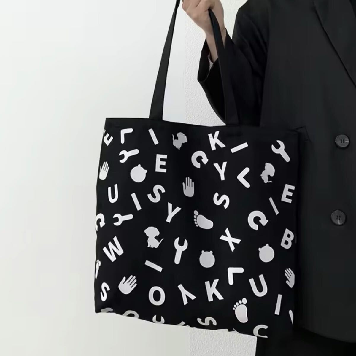 アルファベットやアイコンを散りばめた遊び心のあるデザインが魅力のトートバッグ。シンプルながら個性的な雰囲気を演出し、カジュアルスタイルにぴったりなアイテムです。
