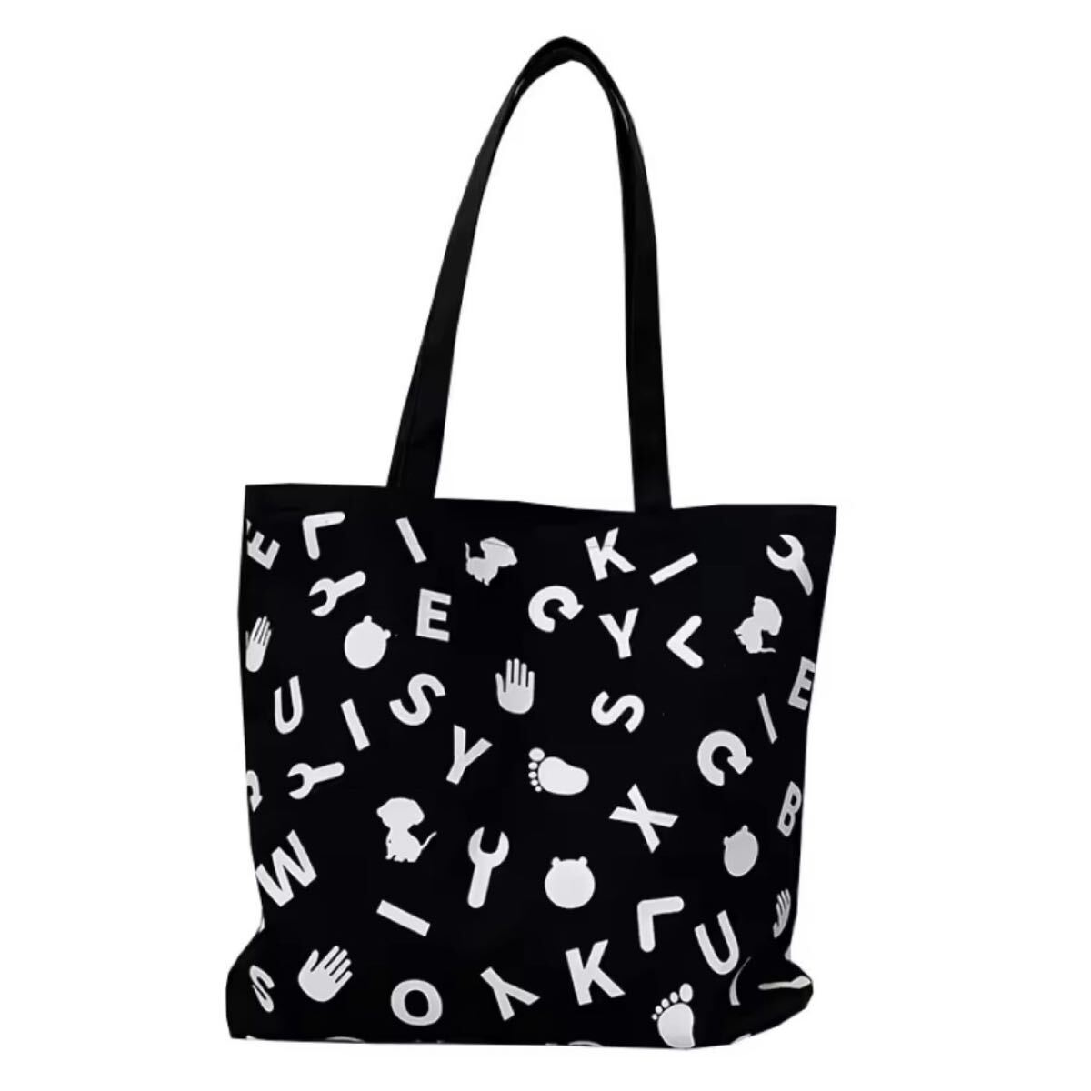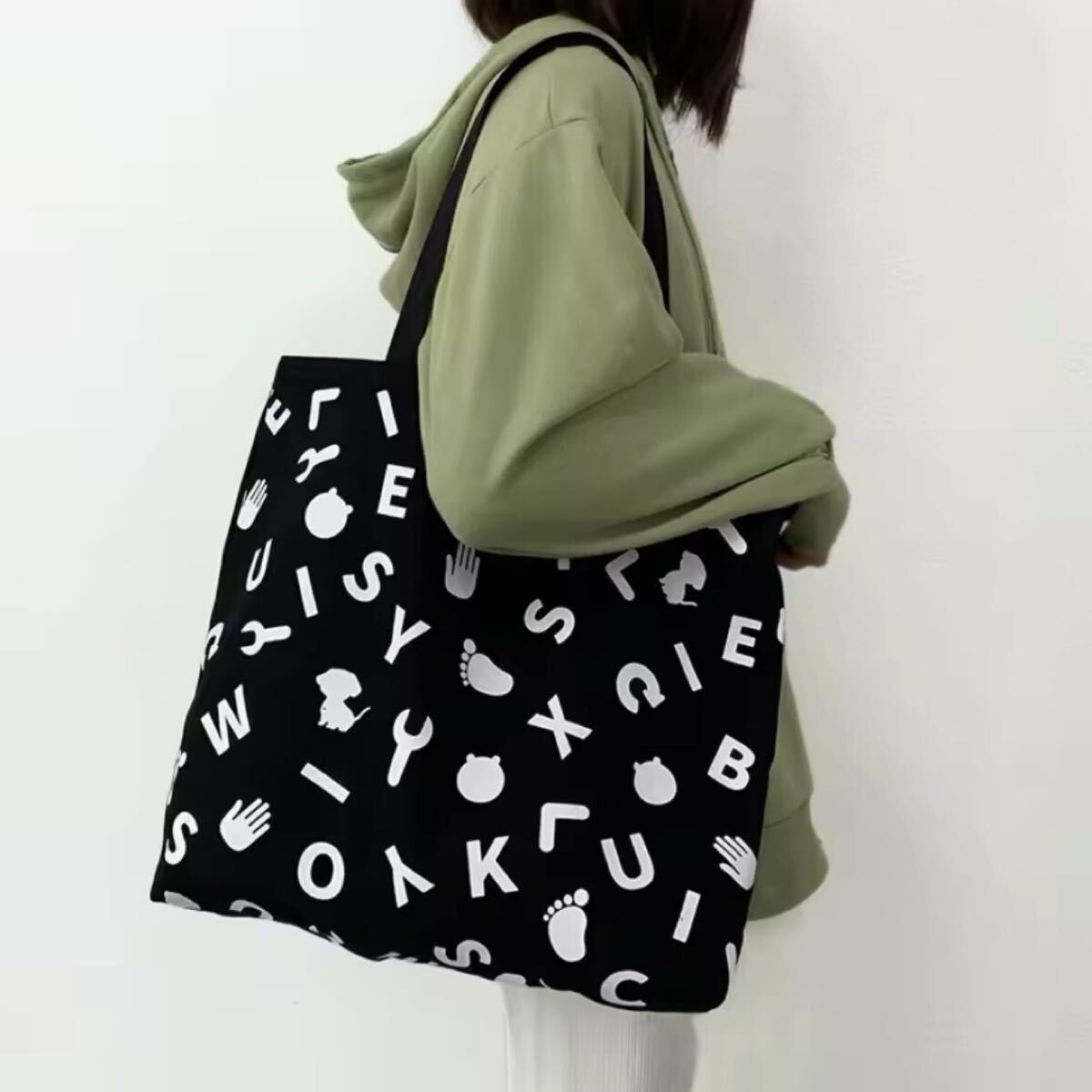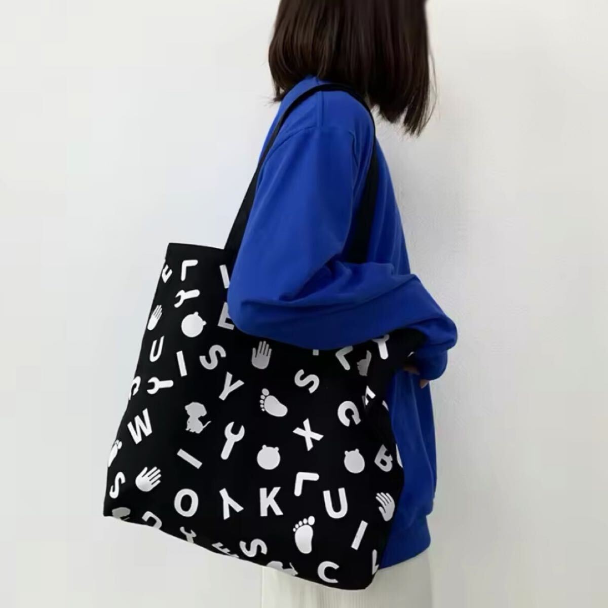 アルファベットやアイコンを散りばめた遊び心のあるデザインが魅力のトートバッグ。シンプルながら個性的な雰囲気を演出し、カジュアルスタイルにぴったりなアイテムです。