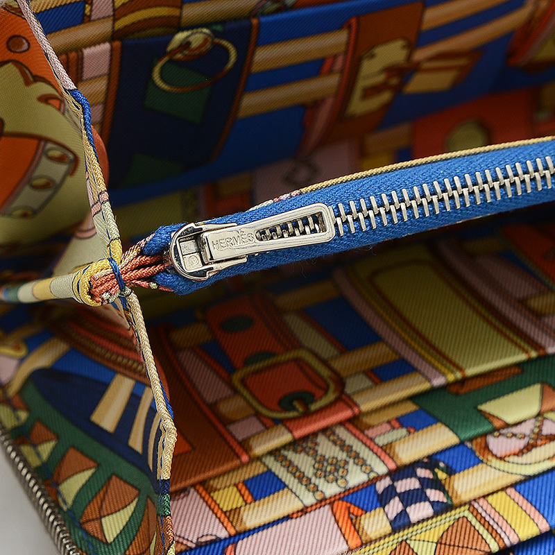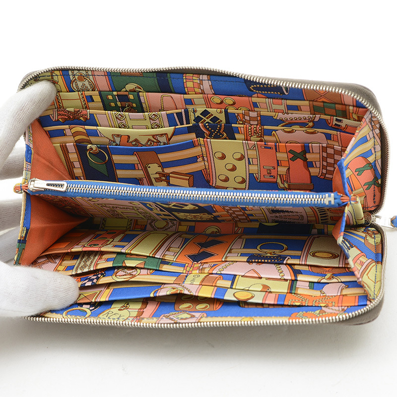 | 商品特徴 | 外側は傷がつきにくいエプソン素材のシックなエトゥープカラー、内側には美しいエルメスのシルクスカーフ柄が広がる、上品さと遊び心を兼ね備えた長財布です。ラウンドファスナーで収納力も高く、日常使いに最適です。 |