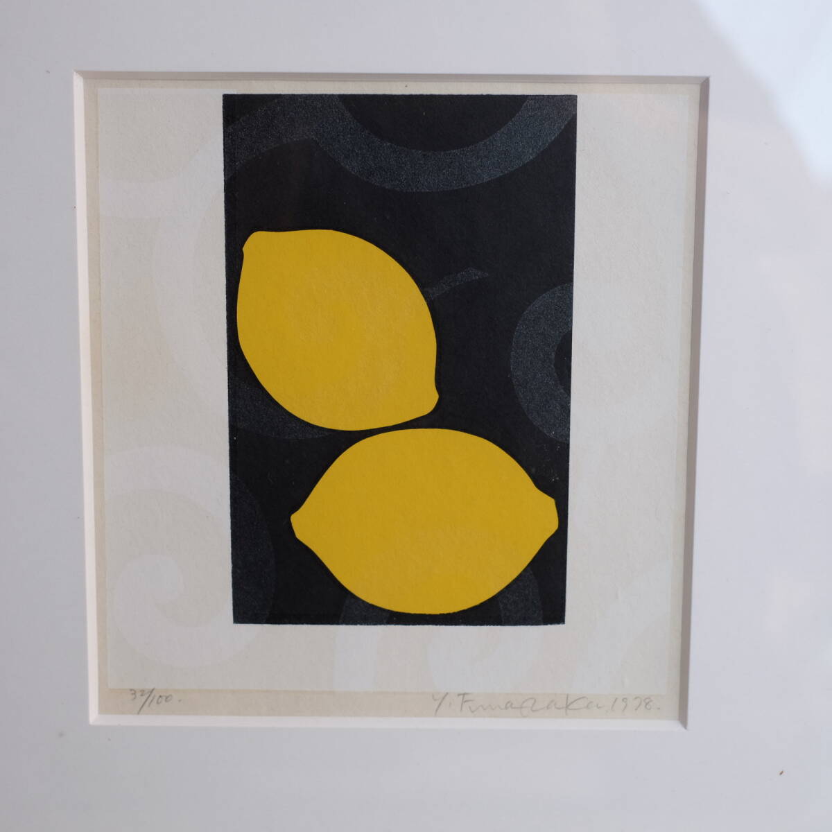 1970年代前後の作品です。 黒地にレモンが配置されており、背景には、薄墨色で丸が見え隠れしています。