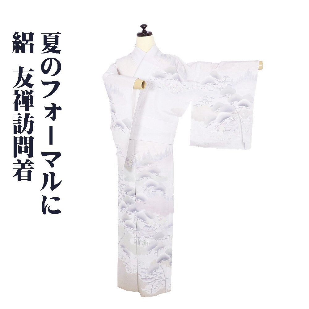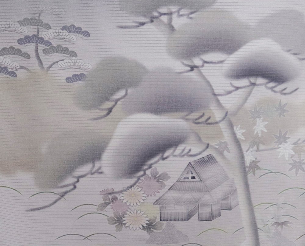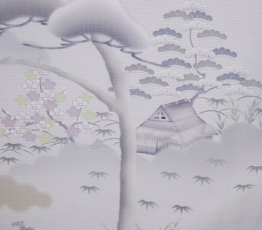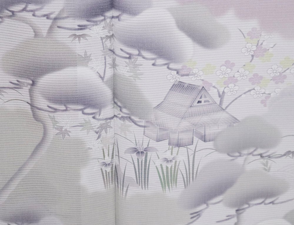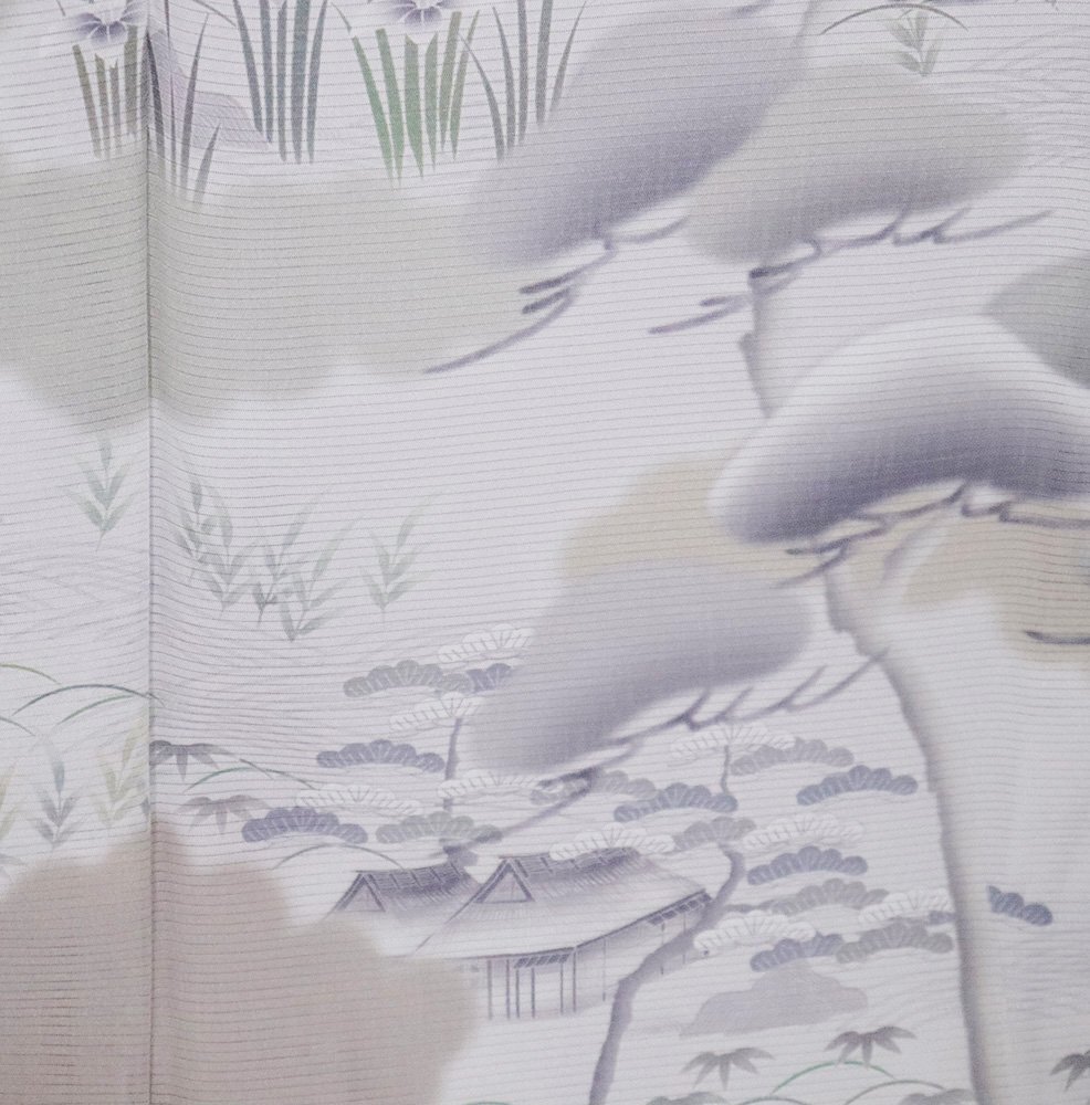 | 色・柄 | 絽 友禅訪問着 丹後縮緬地 薄いピンク色(桜色)・紫(浅紫色)・緑(木賊色)暈し地 茶屋辻・松竹梅・菖蒲 (写真では上手く色が出ない場合があります。ご了承下さい) |