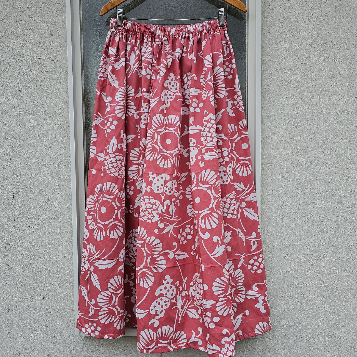 出来上がりサイズは平置きで、ウエスト(総ゴム)35cm、ヒップ110cm、渡り幅、裾幅55cm、総丈(ゴム部含めてて)96cm、股上37cmです。