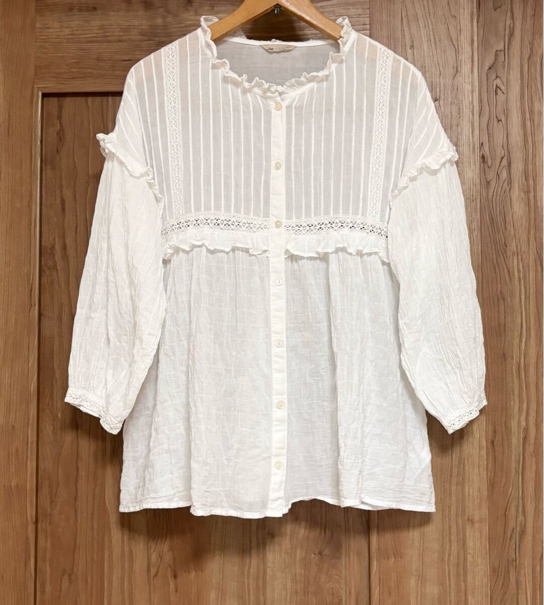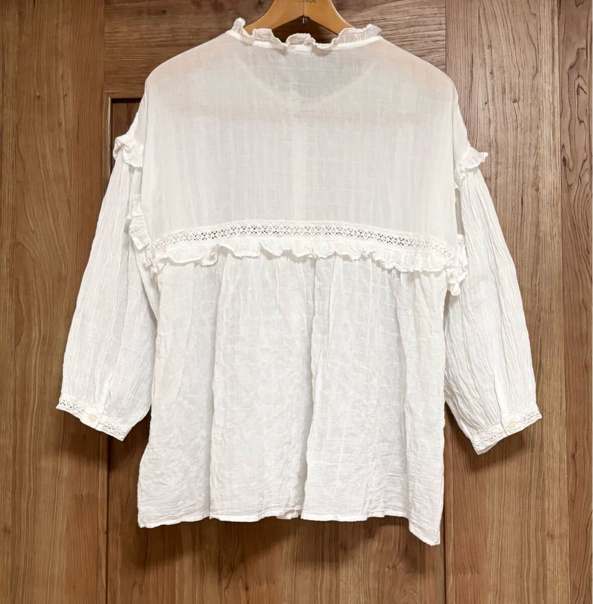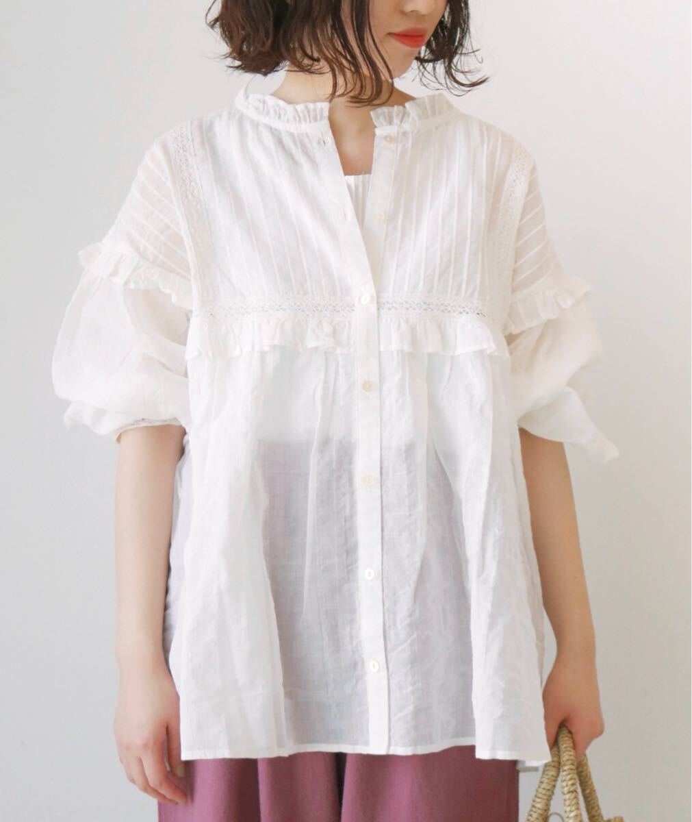 フリルの襟や縁取りが愛らしい表情をプラスするブラウス。