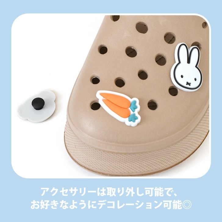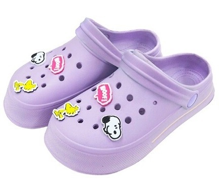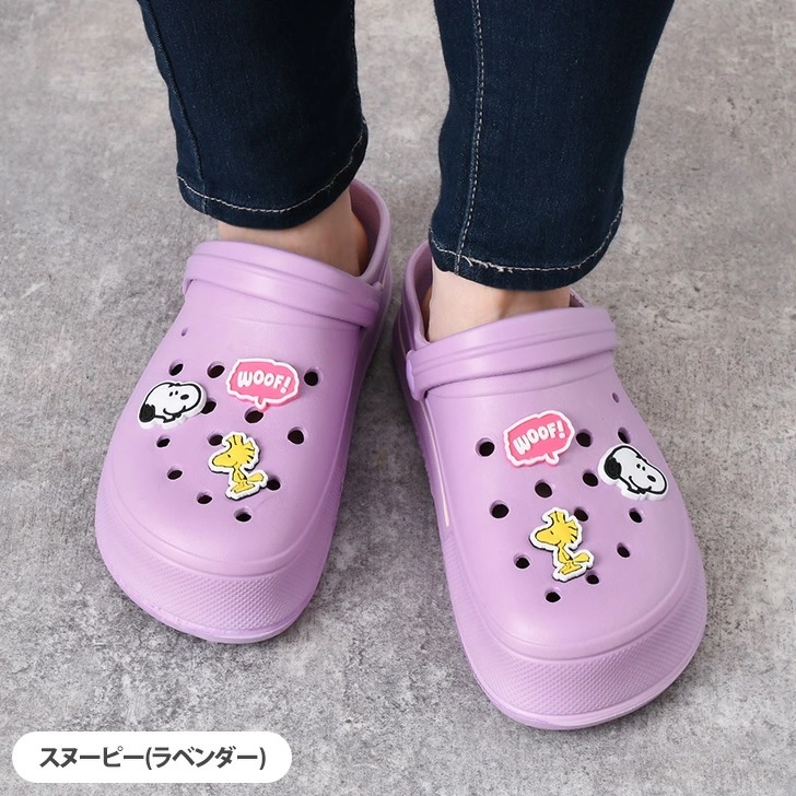 アクセサリー付きの可愛らしいスヌーピーのクロッグサンダルです室内外問わず、ベランダやバスルーム、お散歩時など大活躍アクセサリーは取り外し可能で、お好きなようにデコレーション可能軽量で柔らかなEVA素材を使用し、歩きやすさはもちろん、ふかふかの履き心地も魅力ベルト付きで、使うシーンによって使い分け可能な2way仕様水洗いもできるので清潔に保ちやすく、オールシーズン使える万能サンダルですサイズ:約20cmカラー:ラベンダーパープル素材・成分:EVA、PVC