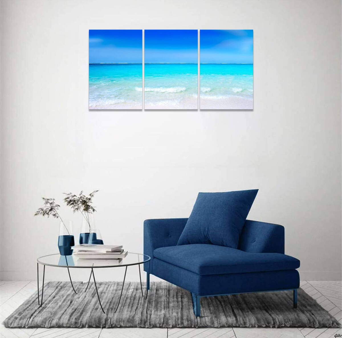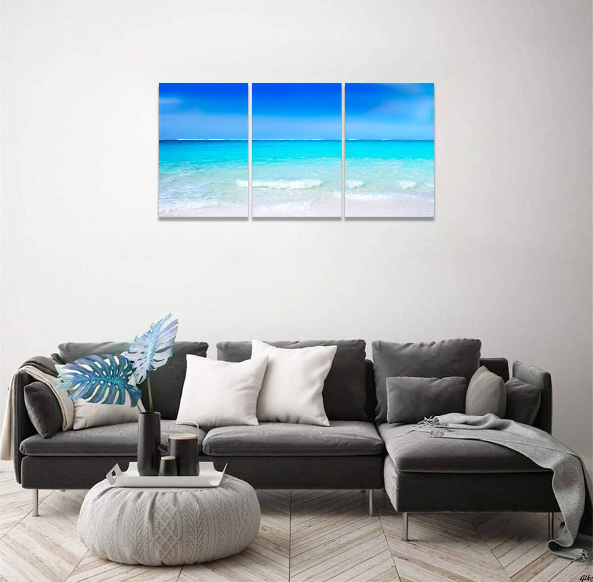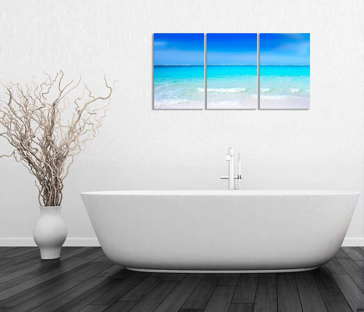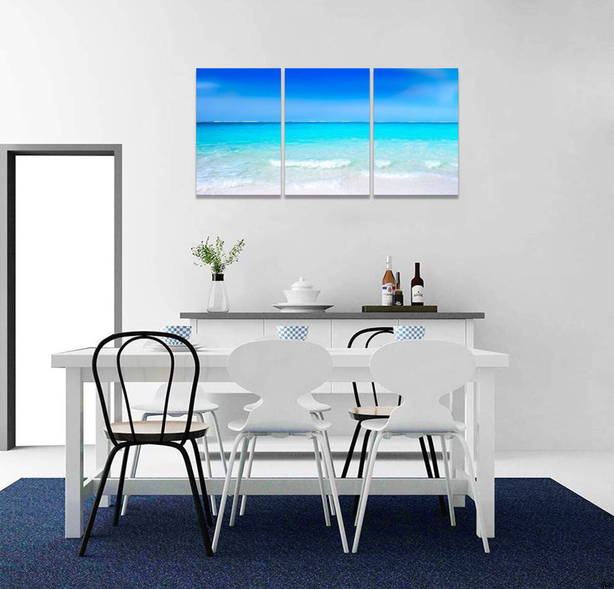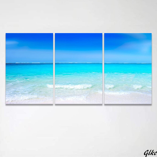 海の爽やかな風景を3枚組のアートパネルで表現した壁掛け装飾です。