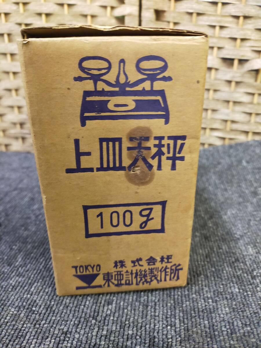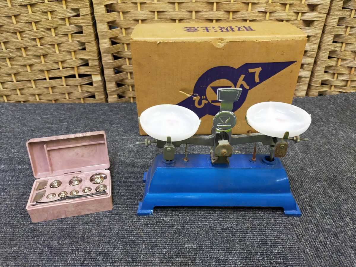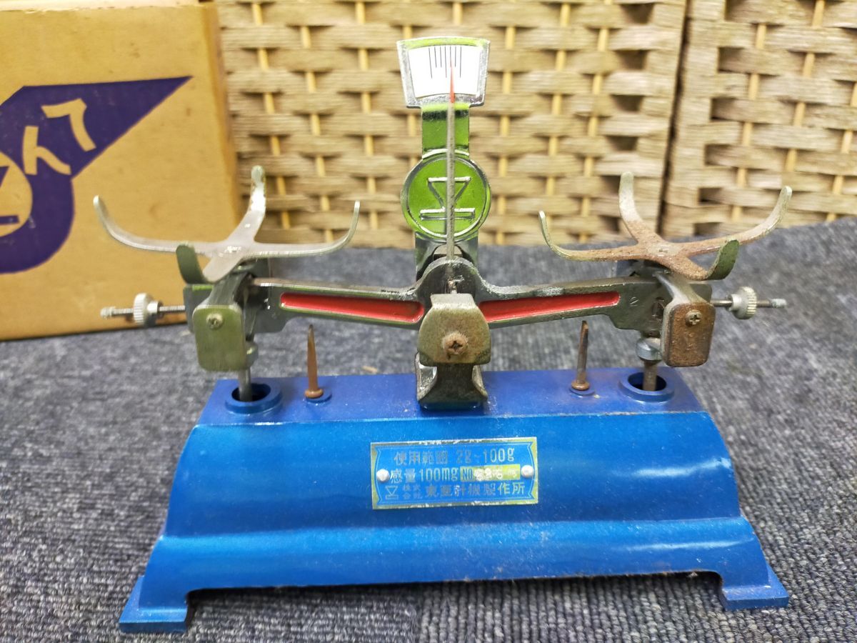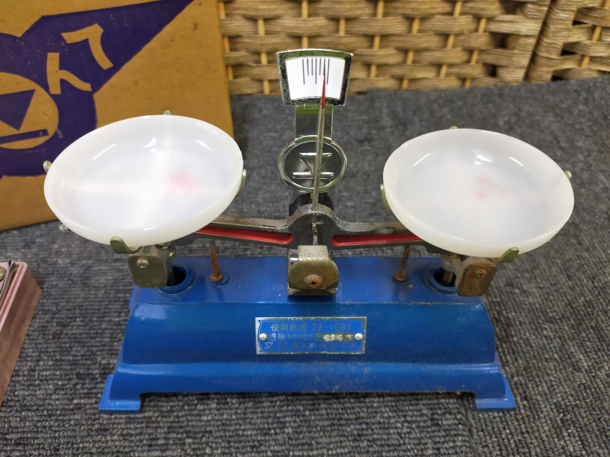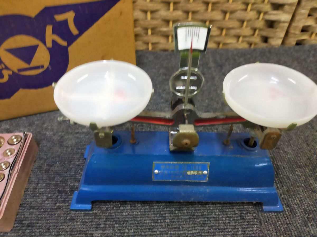 昭和レトロな計量器具、東亜計機製作所製「上皿天秤 100g対応」と、専用の分銅セットになります。