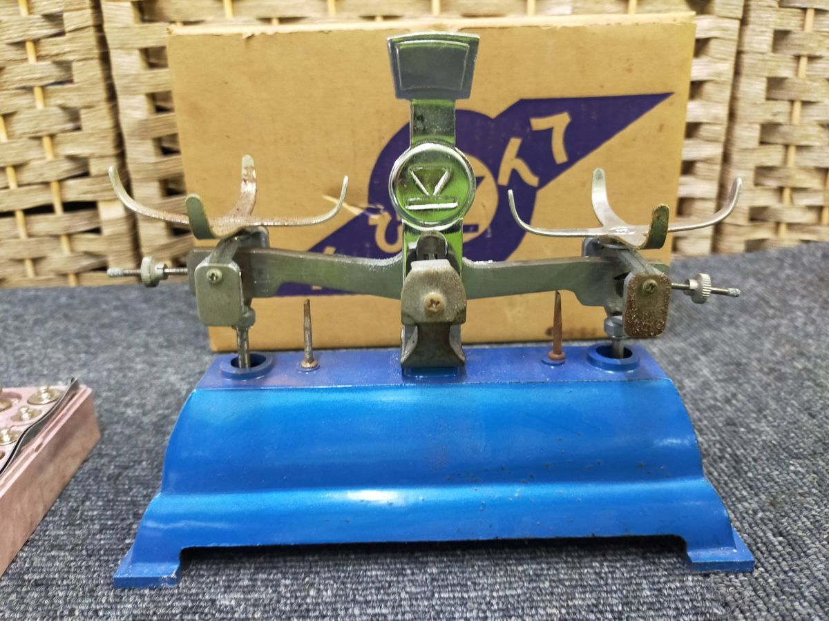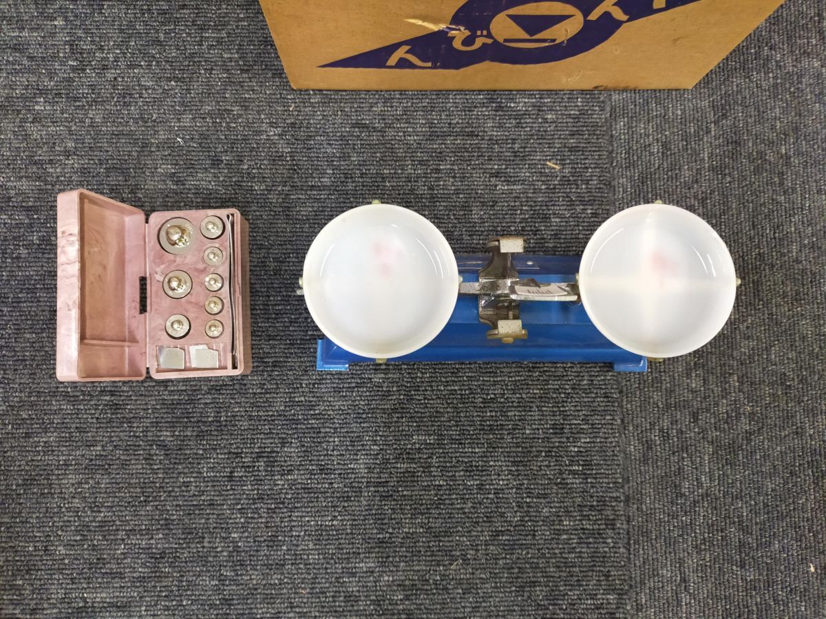 理科の実験や教育用として長年使われてきた、丈夫で味わいのある金属製の天秤です。