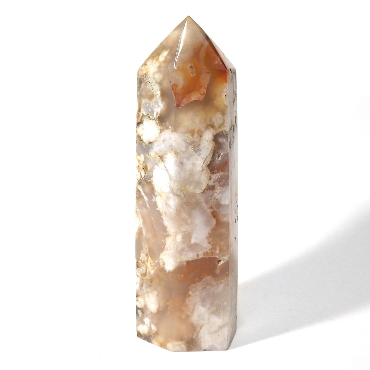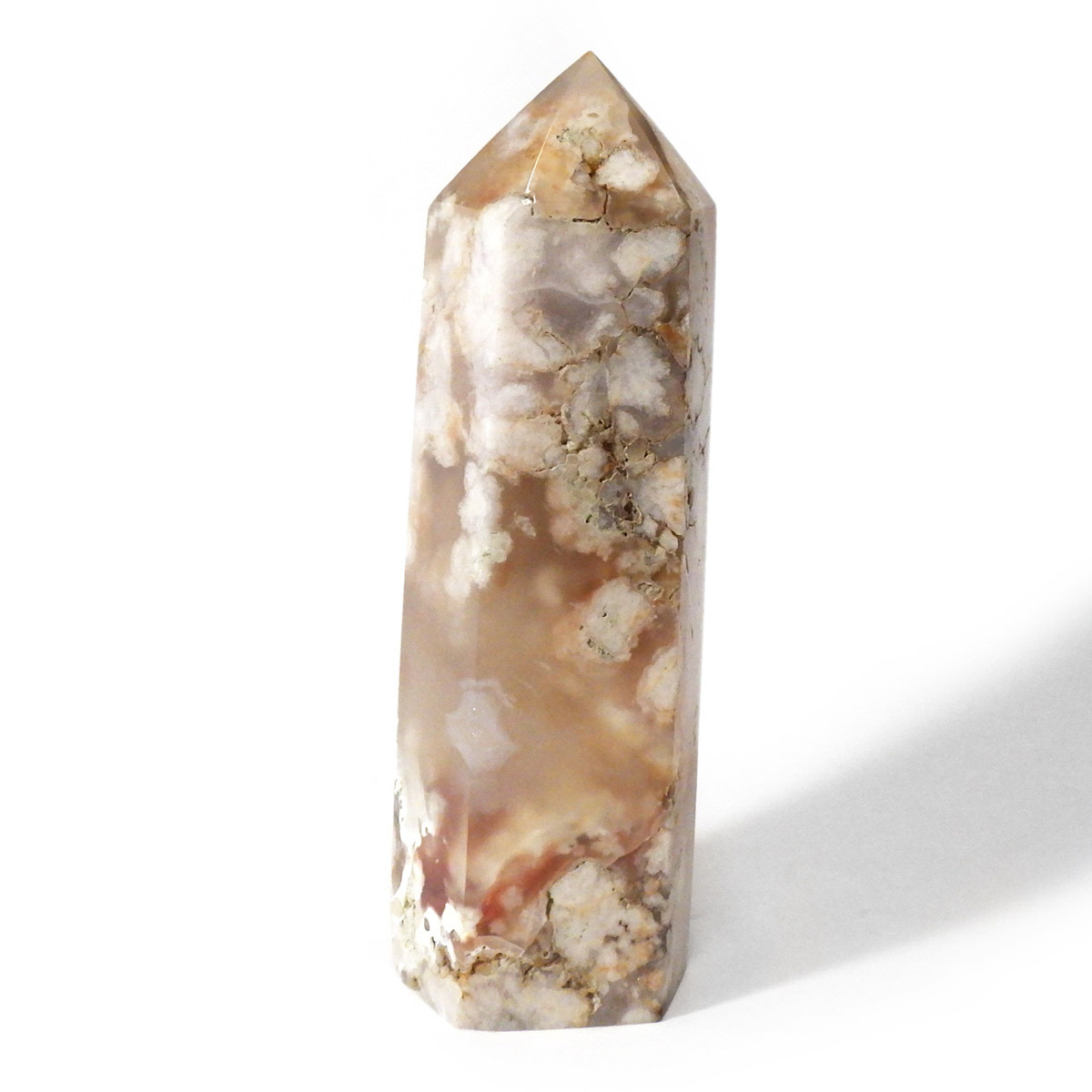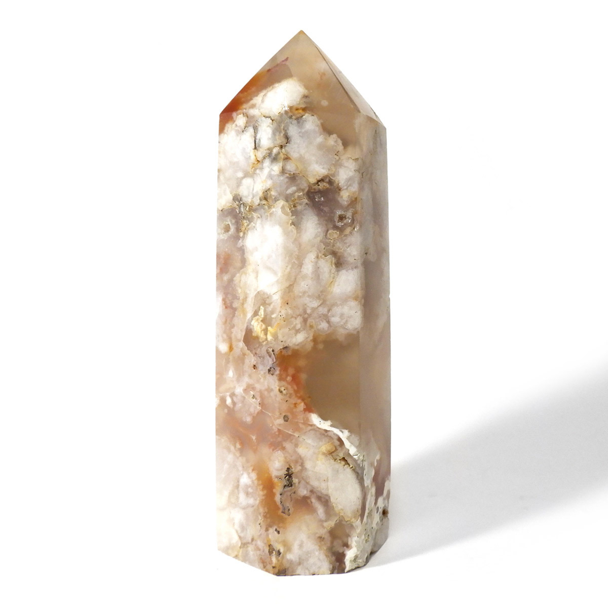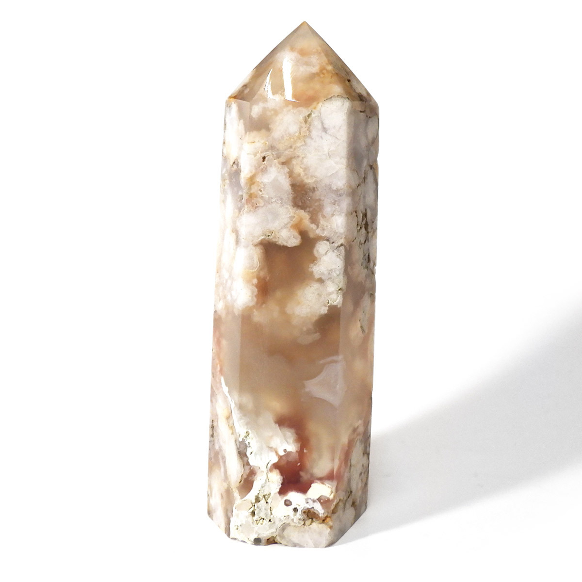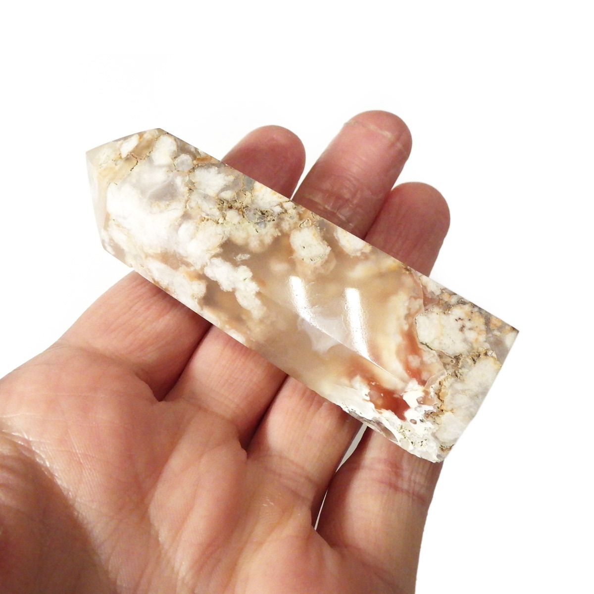 マダガスカル産チェリーブロッサムアゲートのポリッシュポイントです。桜の花を思わせるような優しい色合いと、花びらのような模様が特徴です。淡いピンクからオレンジ色の部分はカルセドニーで、近年流通し始めた新しい石種ですが、通常のめのうと異なり染色されていない天然の色味を持つものは非常に希少です。桜の花のように、一瞬で人の心を惹きつける魅力があり、実際に手に取るとその可愛らしさに思わず見入ってしまいます。天然石のため、内包物や模様は一つひとつ異なり、世界に同じものは存在しません。手元にそっと咲く小さな桜を、どうぞお楽しみください。
