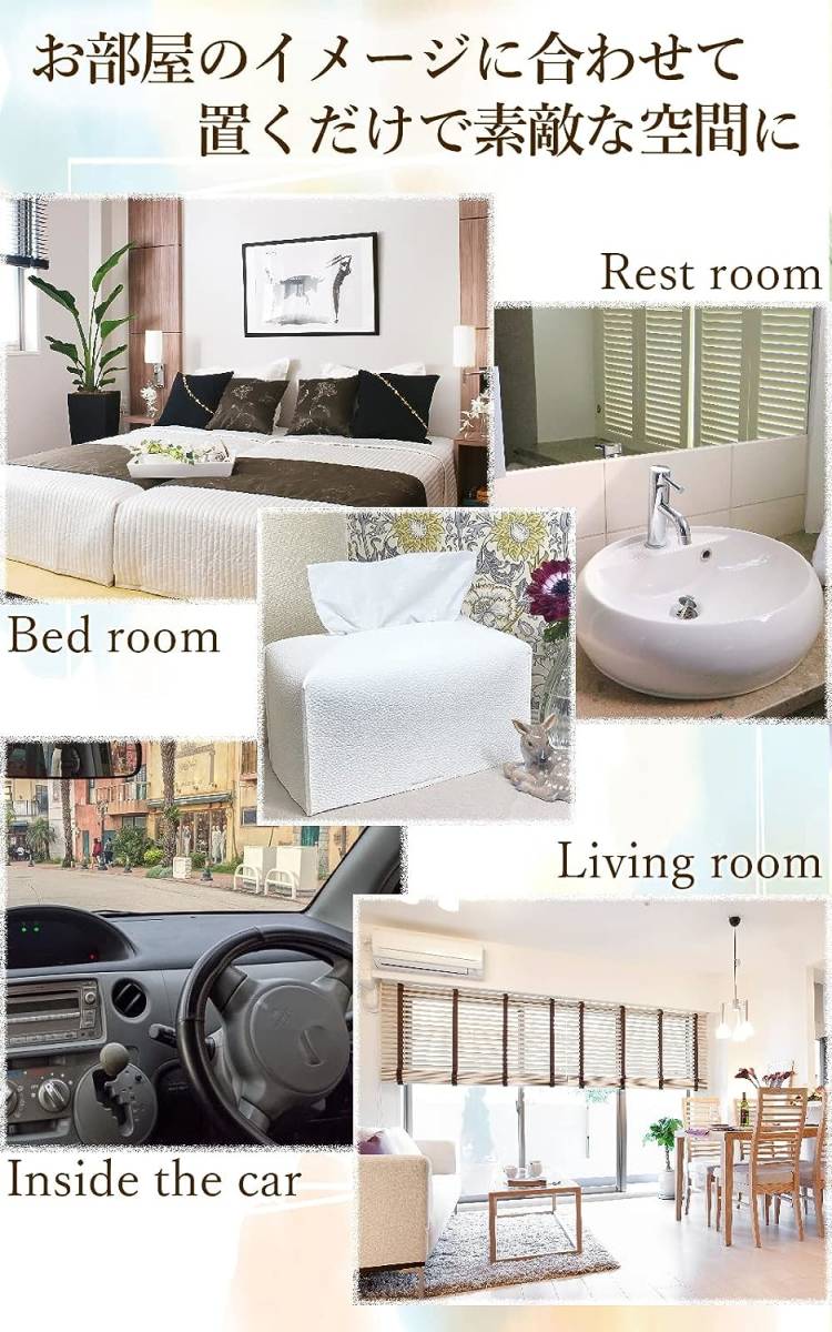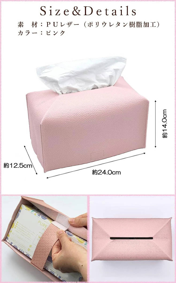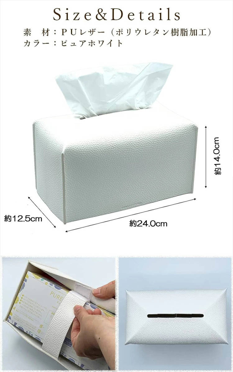 ※画像1枚目のホワイトをお送りします。 【ご購入前のご注意:重要】 当商品のサイズは約24.0cm×14.0cm×12.5cm(横×縦×厚み)となっております。 鼻セレブ、贅沢保湿、カシミヤティッシュなどは箱の長さが25cmほどあり、当商品とは適合しません。 メーカーから色々なサイズのボックスティッシュが発売されておりますため、事前にご利用になっているティッシュ箱のサイズをご計測の上、ご購入のご検討をお願いいたします。 サイズが合わないという場合や、無理に被せて破損した場合などご返品等をお受けすることが出来かねてしまいます。 何卒よろしくお願いいたします。 ※この商品はティッシュカバーのみとなりまして、 ティッシュペーパーは付属していませんためご了承ください。 【 サイズ】 約24.0cm×14.0cm×12.5cm(横×縦×厚み) の厚型で深型のティッシュカバーです。 【カラー】ホワイト・ブラック・ピンク ※ピンクのお色は実物が画像より少し暗めなお色となっております。 ・ 薄型のボックスティッシュなら2段重ねて被せられるティッシュケースです。 ・ ティッシュカバーの高さが13cmあるので高さ厚型のボックスティッシュにも対応しています。 ・鼻セレブ、贅沢保湿、カシミヤティッシュなどは箱の長さが25cmほどあり、当商品とは適合しません。 ・詰め替え用の箱なしティッシュ用ケースとしても3段重ねで利用できます。ボックスティッシュの予備を収納しておける便利で使い勝手の良いティッシュカバーです。 ・ リビング、ベッドルーム、キッチン、洗面所、車の中などお部屋の雰囲気に合わせてお洒落にお使いください。 また、流せるペーパータオルを入れてトイレに置くことでタオルが不要になって衛生的です。 ・ 素材:PU(ポリウレタン樹脂)レザーにシボリ(シワ)加工を施し、高級感のある外観に仕上げています。 ※商品の色合いはお使いのモニターによって異なって見えますので予めご了承くださいませ。 ・ 商品内容:ティッシュカバー=1枚(※この商品にはティッシュペーパーは付属していません。) |