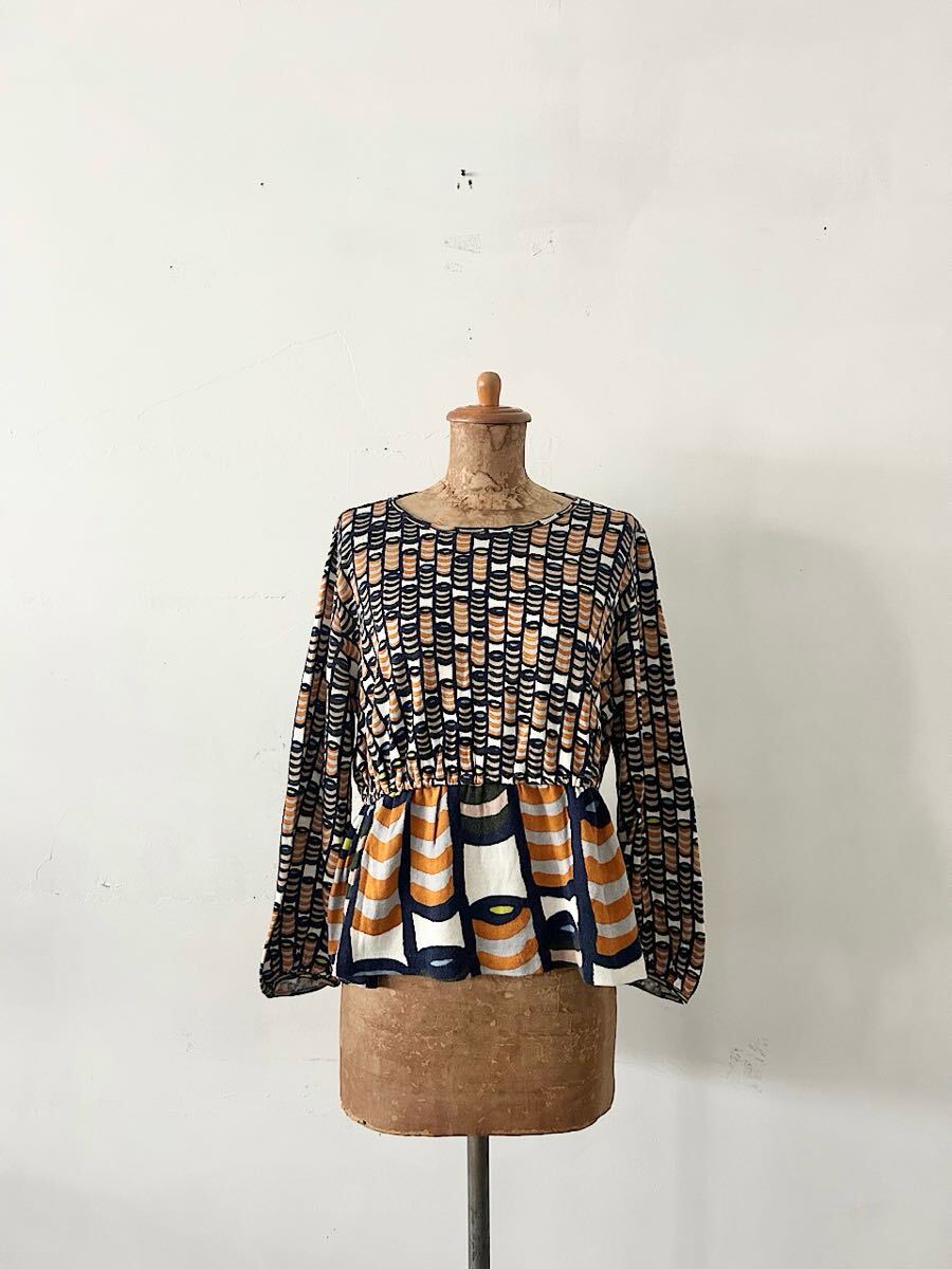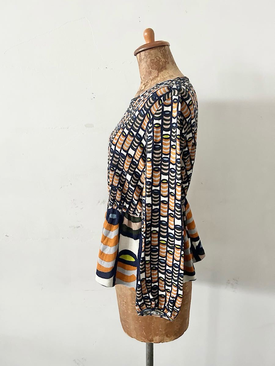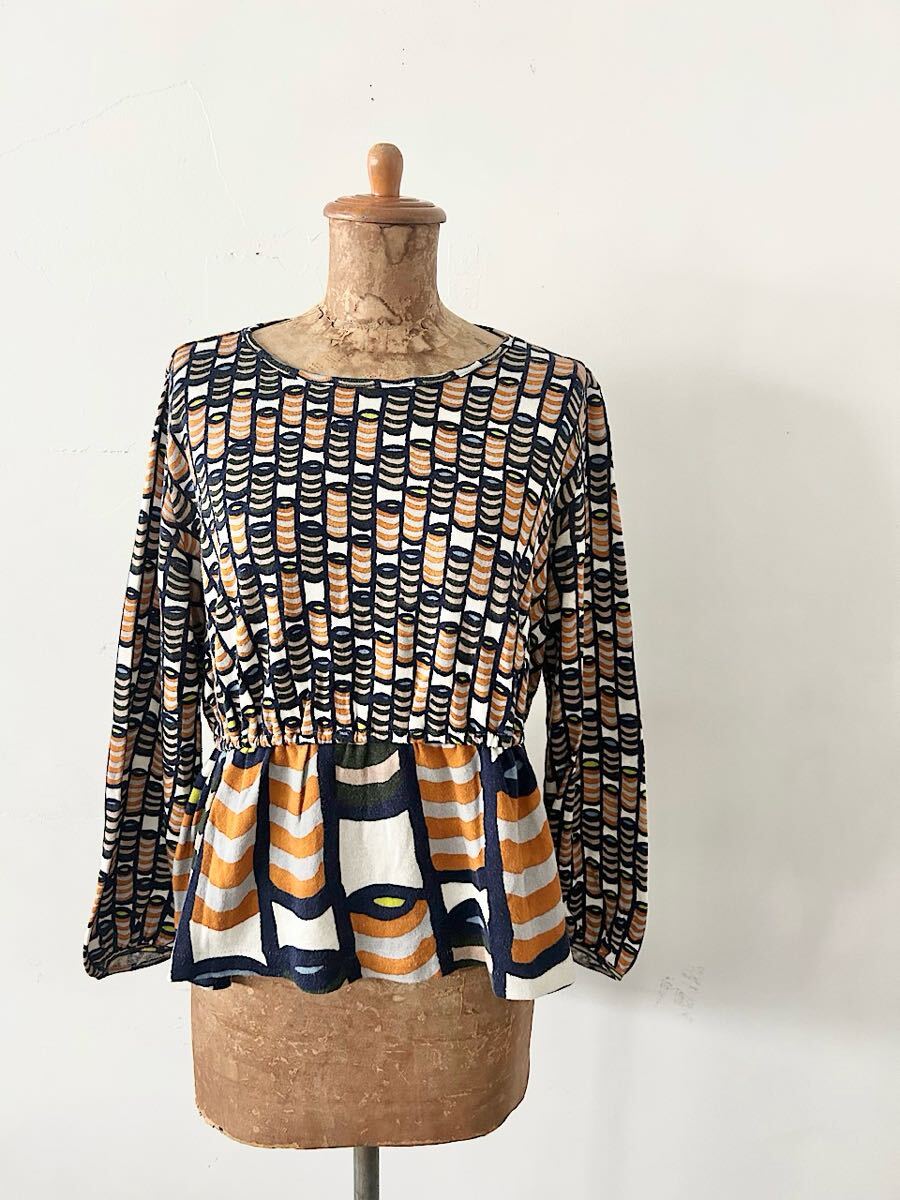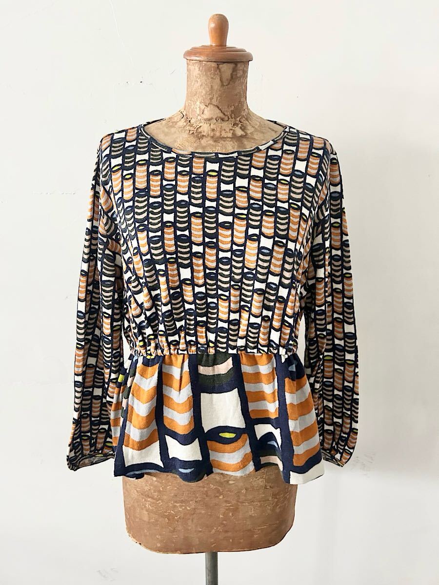 bonbonのテキスタイルのコットンカシミヤ裏毛プリントペプラムカットソーです。