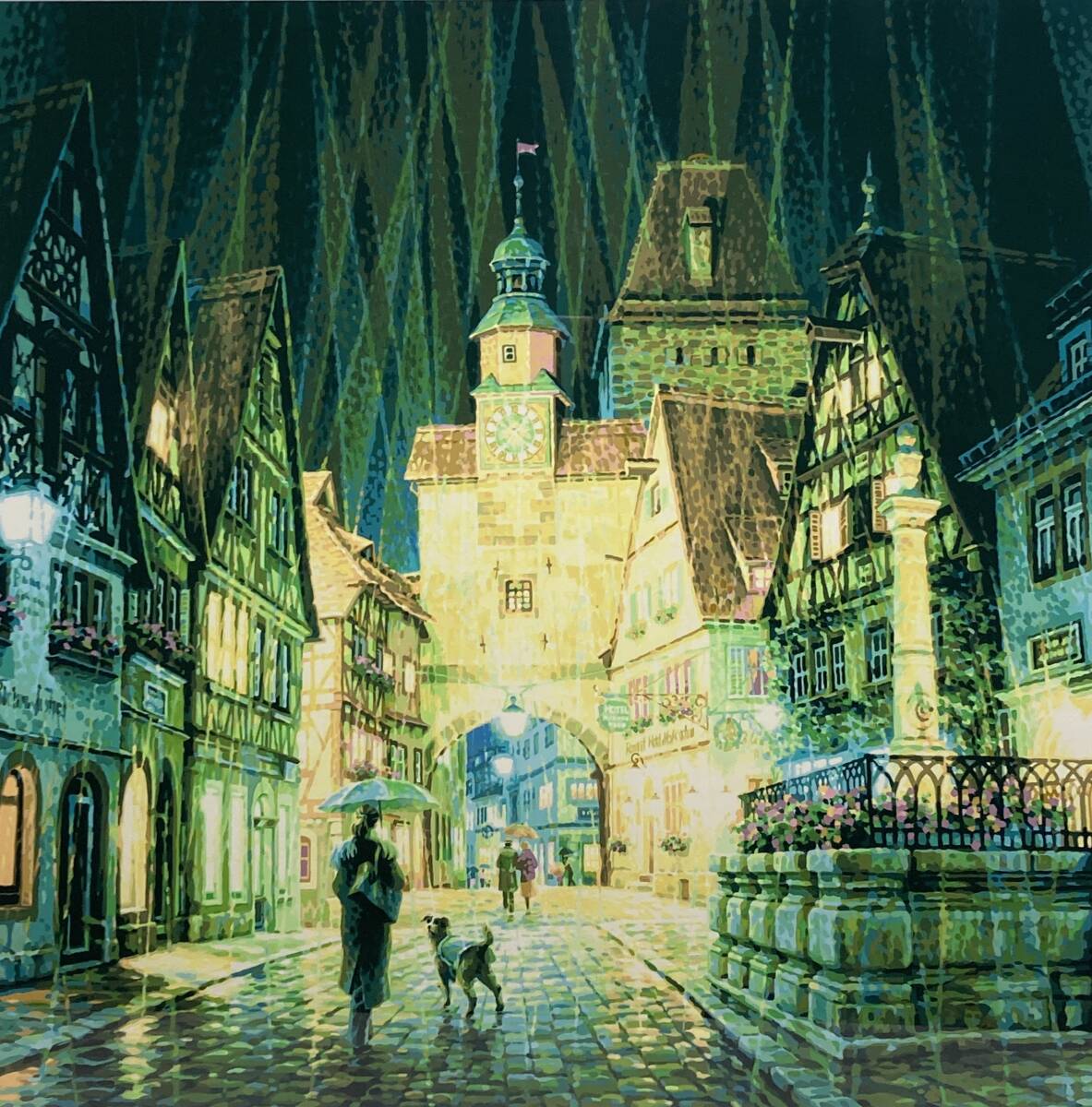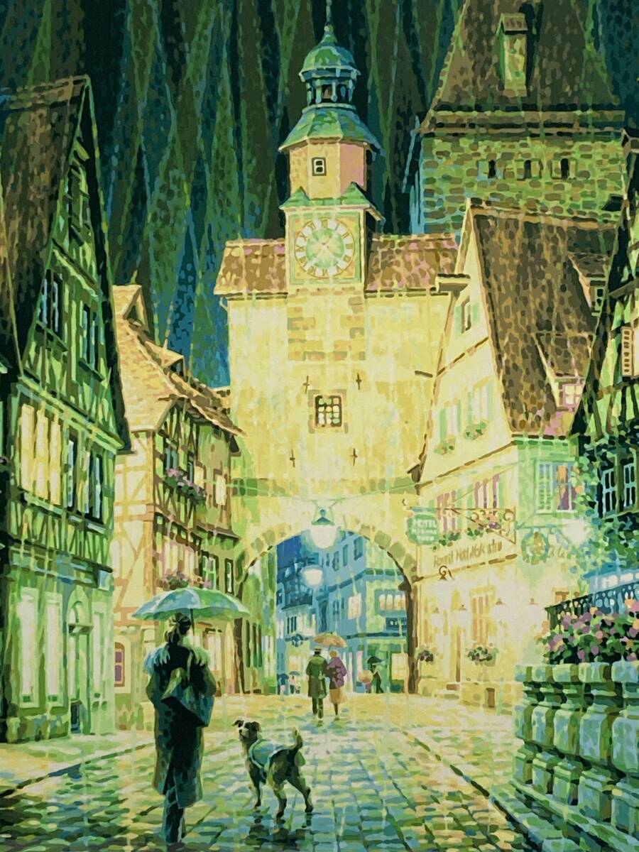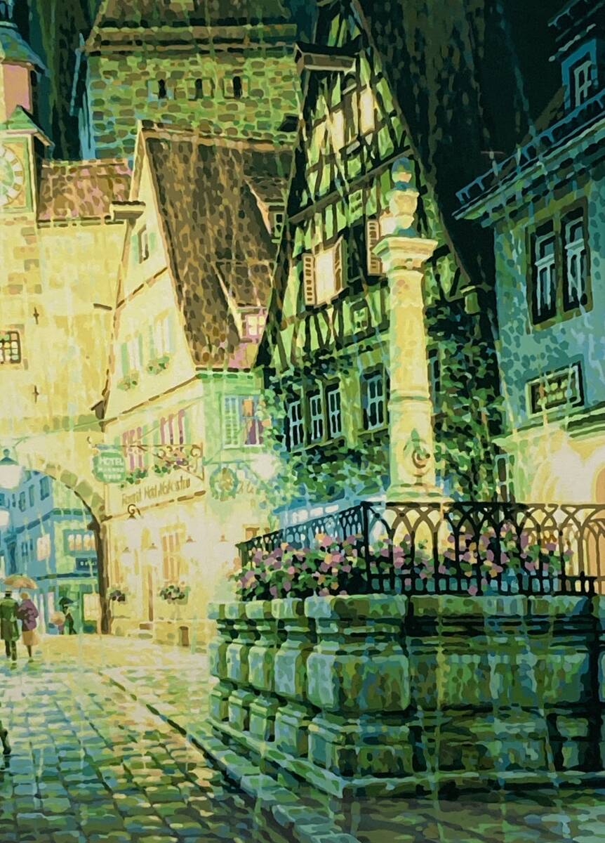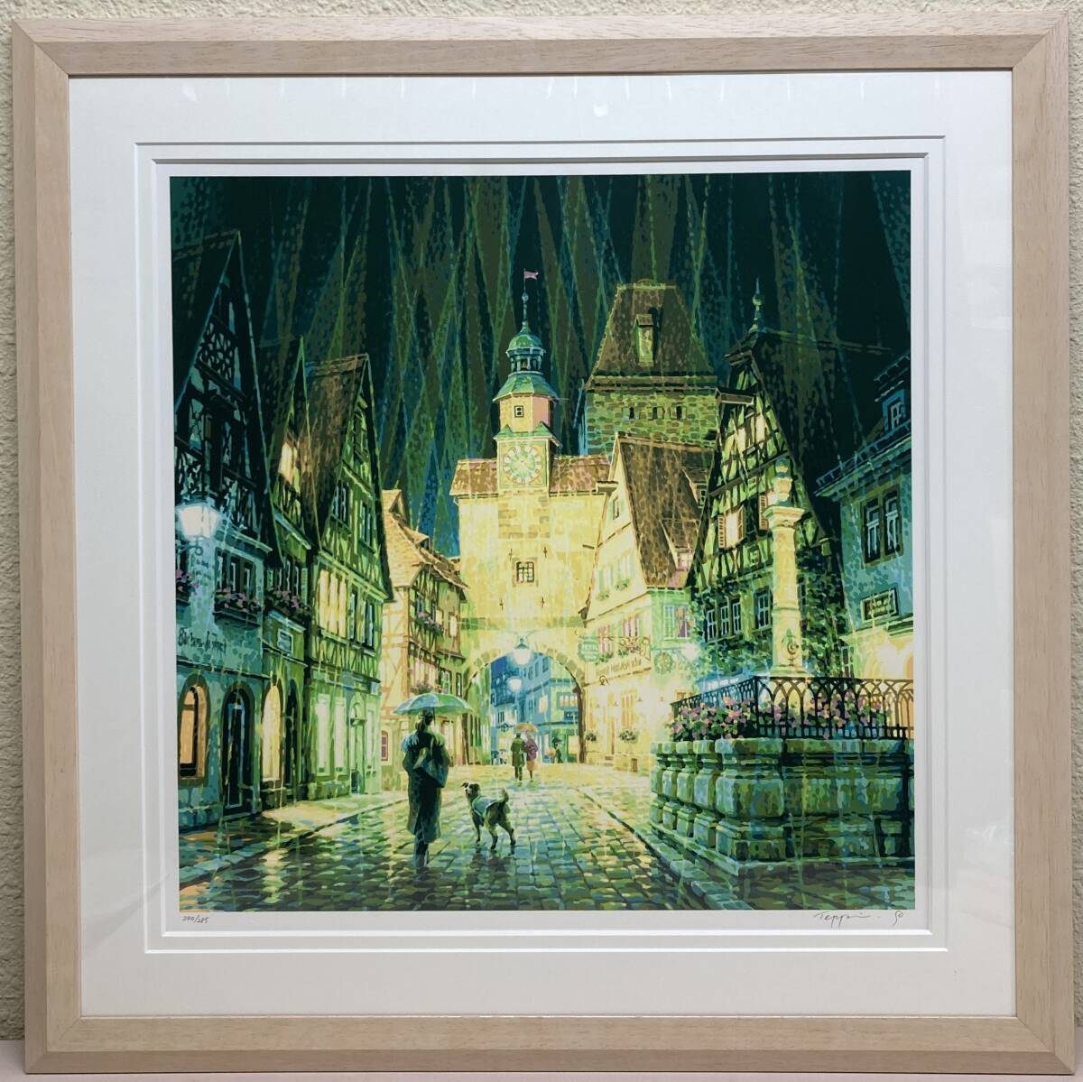 笹倉鉄平「ローテンブルクの雨」シルクスクリーン 直筆サイン入り 光の情景画家 "心が安らぐ"絵 額装 真作保証