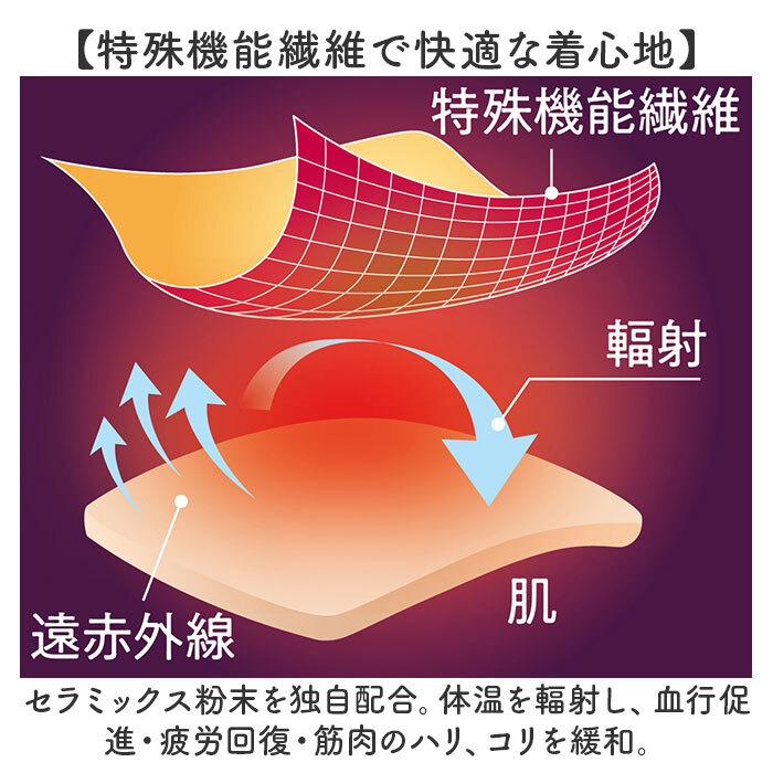| 商品説明 | ・・【お休みタイムに疲れをリカバリー】 ・着る疲労回復◎アクティブな毎日へ!「リカバリーケアレディース半袖シャツ」。 ・【特殊機能繊維で快適な着心地】 ・セラミックス粉末を独自配合。体温を輻射し、血行促進・疲労回復・筋肉のハリ、コリを緩和。 ・【サラリとした質感でストレスフリー】 ・肌当たりが優しい、ポリエステル&コットン混紡素材。チクチク感もなく、睡眠を妨げない◎ ・【リラックス時間の着用がおすすめ】 ・就寝時や、ホッと一息つく時間に着用。汗ばむ季節にぴったりな、半袖タイプ。 ・【着こなしやすいクルーネック】 ・胸元をガードしつつ、首元が詰まりすぎないネックデザイン。 ・【機能面はそのままに、丸洗いOK】 ・ネットに入れて、洗濯機洗い可能。洗濯しても機能はそのまま、いつも清潔をキープ。 ・(※)洗濯機の弱モードをご使用ください。繊維自体に練り込まれているため、繰り返し洗濯しても機能を発揮します。 ・【頑張っている方へのギフトにも】 ・忙しい時こそ、しっかり休息が必要◎心地よい睡眠をサポートし、目覚めもすっきり。 |