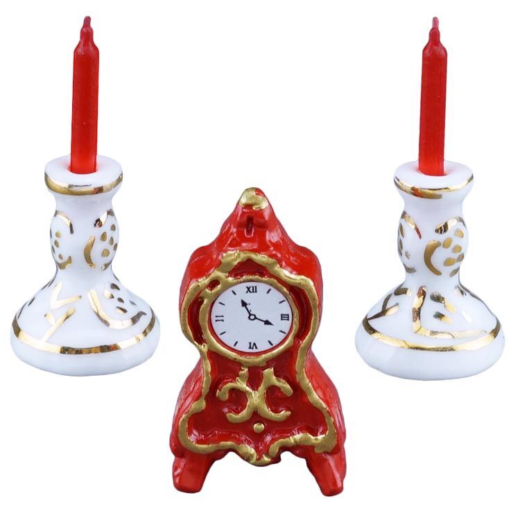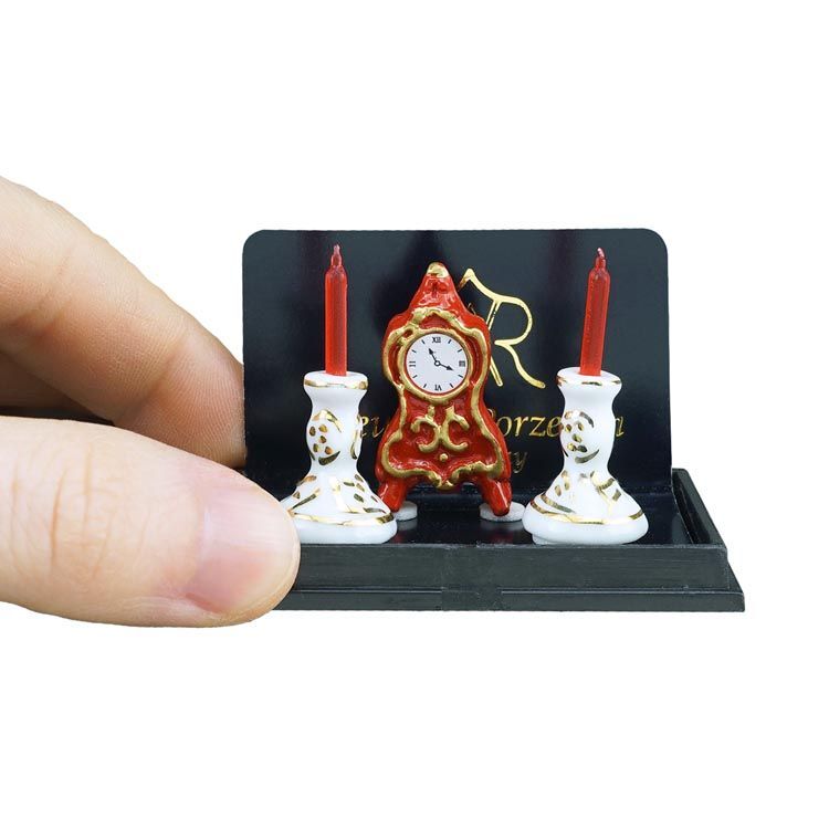 ドイツロイター社製のミニチュアです。赤いキャンドルで、暖炉のアクセントになりますね!ぜひ貴方のドールハウスにお役立てください。キャンドルの直径13ミリ、高さ約30ミリ。時計のサイズ:15x6xH28ミリ。