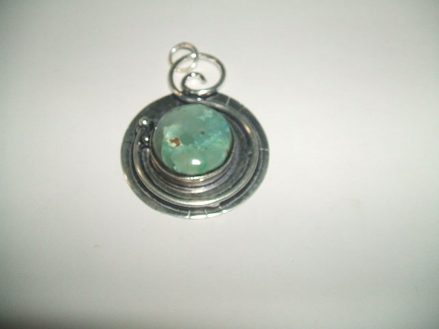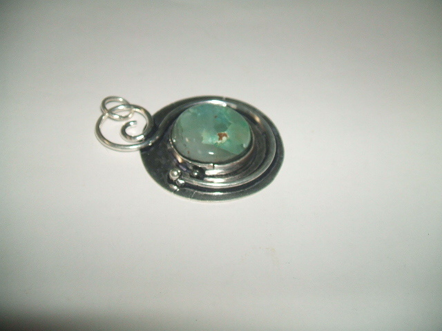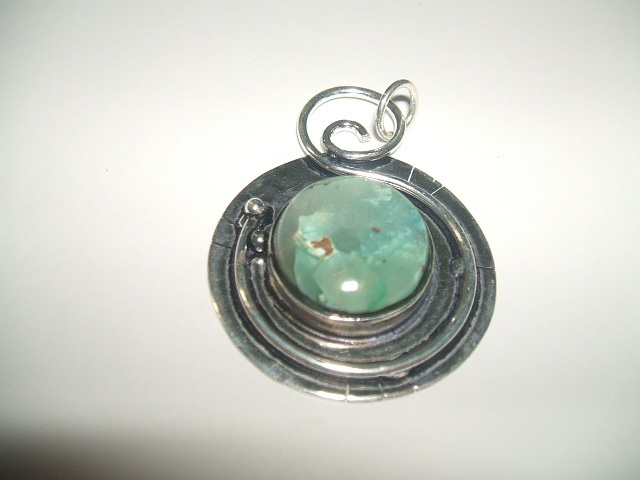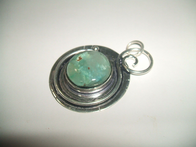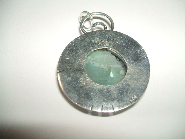 ラウンド型のプレートに薄緑のクォンタムクワトロシリカがついたアンティーク風デザインのトップです。石の大きさは直径1.9センチ。1ヵ所小さな凹み(左中央付近の茶色の部分)がありますが、これは原石由来のものです。また石枠の金属に小さな切れ込みが1ヵ所あります。トップ全体の大きさはラウンド型のプレートが直径3.5センチ。金属はシルバーで925の刻印があります。