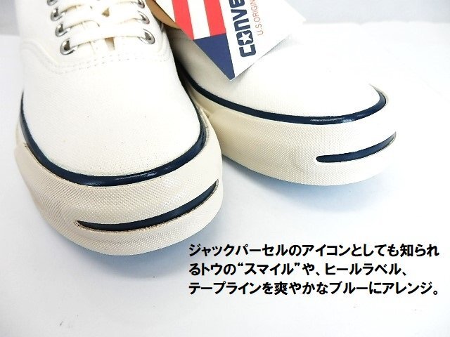 IVYルックにみられる内羽根仕様を採用した「U.S. ORIGINATOR」 高品質のスペックのジャックパーセル。レトロ感が人気です。 1973年のアーカイブである「ウィンドジャマー」をベースに、 テープラインや踵の割縫いパターンなどのディテールを落とし込んだデザイン。 ジャックパーセルのアイコンとしても知られるトウの“スマイル”や、ヒールラベル、 テープラインを爽やかなブルーにアレンジ。 スキッドグリップを思わせるデッキシューズスタイルに、 つま先にはスマイルラインが入ったジャックパーセルの変わり種。 |