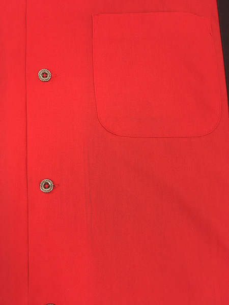ハリのあるポリコットン素材・襟芯なし・トップボタンなしのオープンカラー・左胸にネームステッチ。